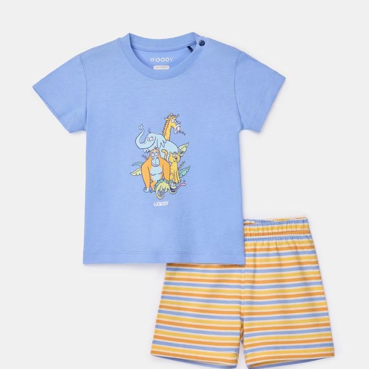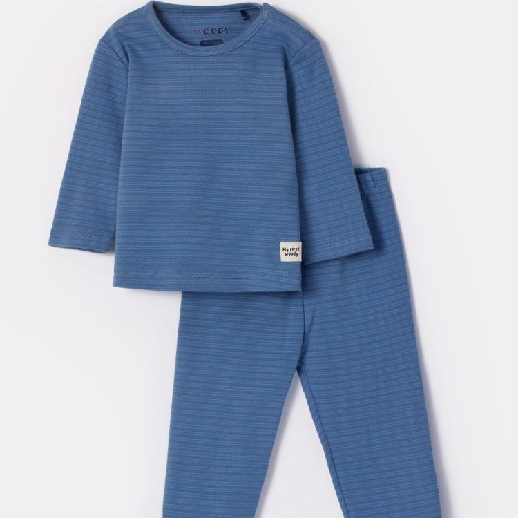 Gestreepte pyjama in velours met blauwgrijze broek en kat