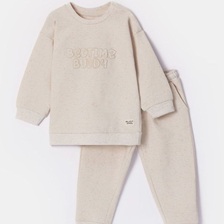 Blauwgrijze pyjama in velours met gestreepte broek en kat