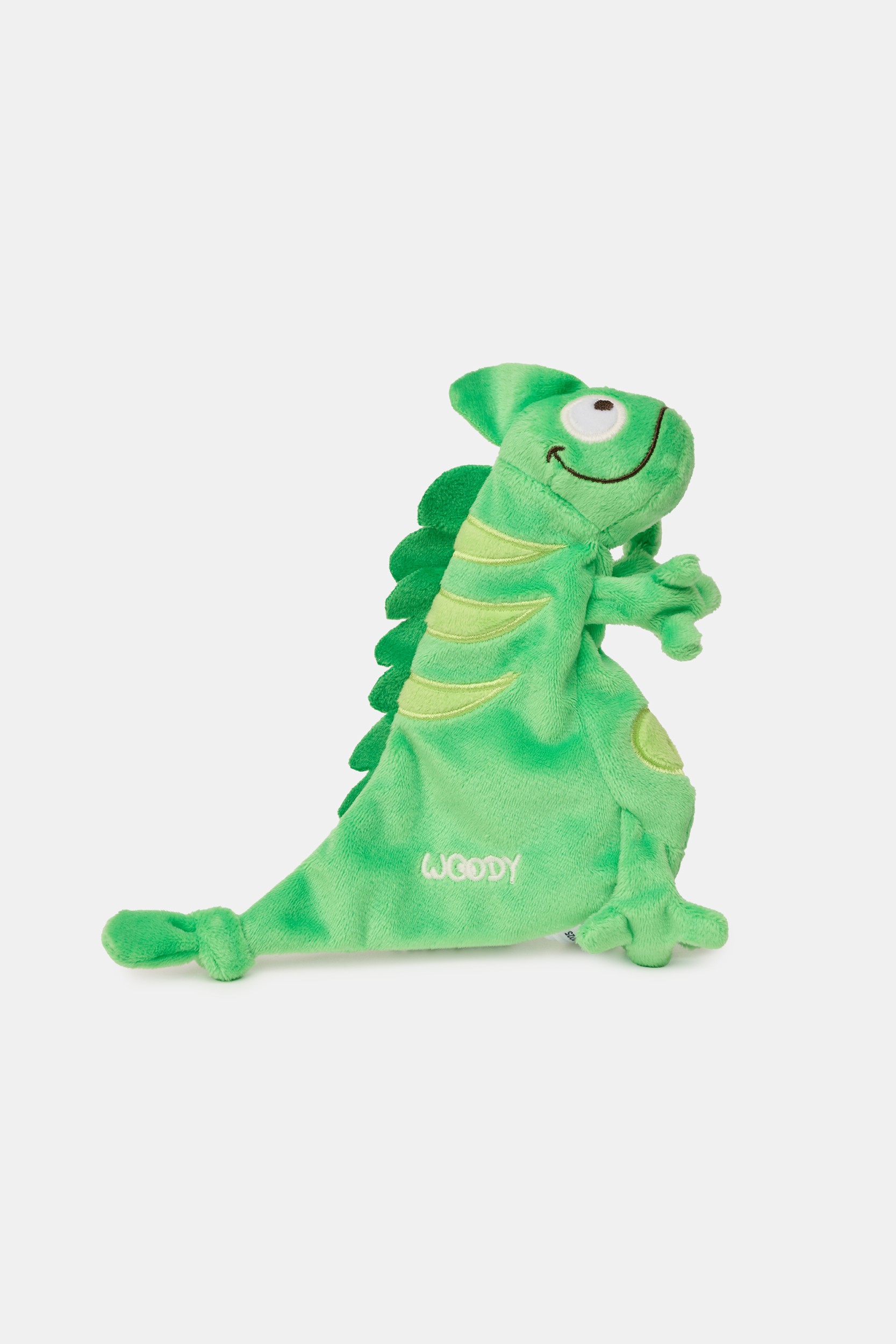 261-10-DOU-V/010Groen knuffeldoekje van velours in de vorm van een kameleon. Het knuffeldoekje is +-23 cm groot.