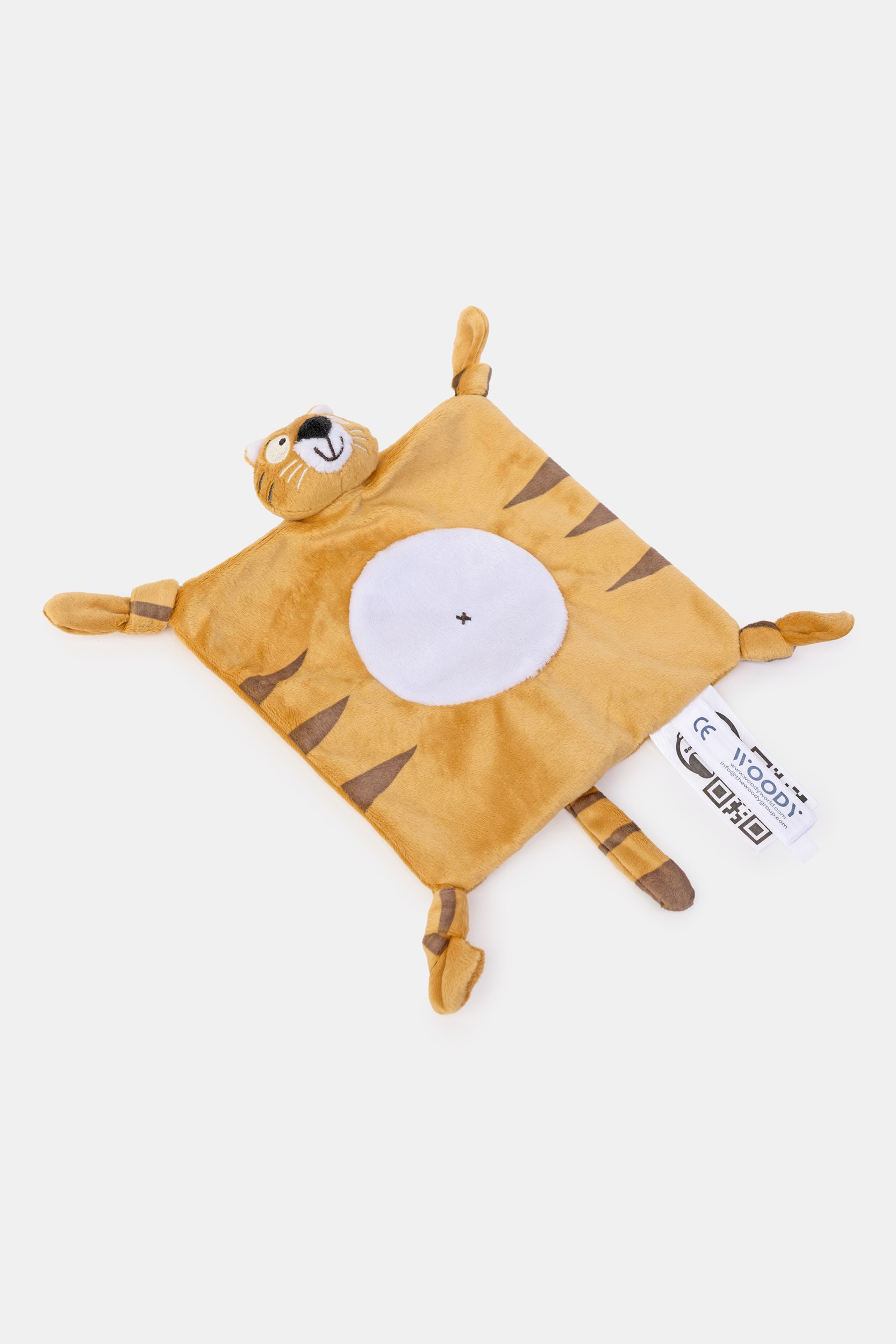 261-10-DOU-V/020Knuffeldoekje van velours in de vorm van een tijger. Het knuffeldoekje is +-23 cm groot.