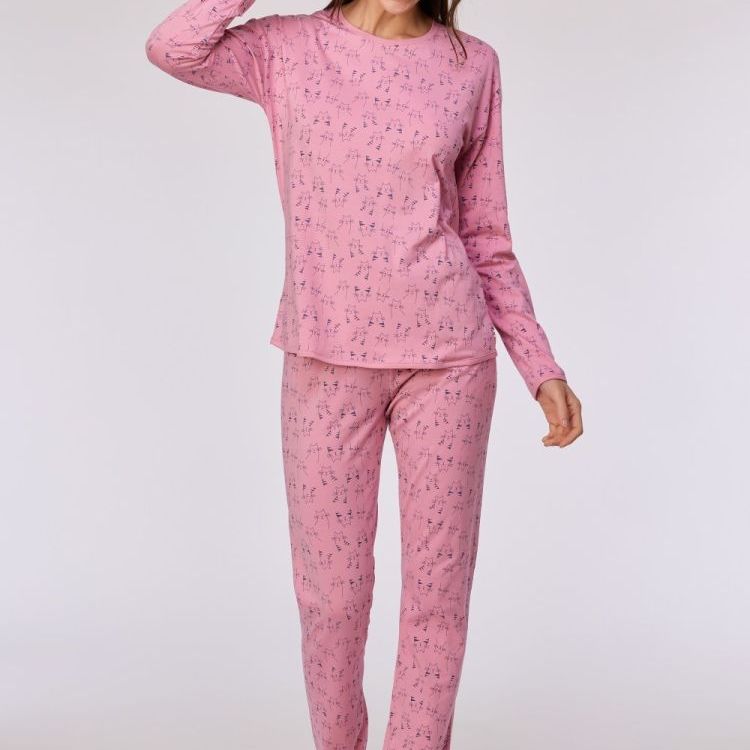252-10-PZG-Z/923Roze pyjama van soepel katoen. De pyjama is volledig bedrukt met een kattenprint, zowel op het bovenstuk als op de broek. Verkrijgbaar in de maten 0m-XXL. Voor de maten 0m-8y is er een sluiting in de rug voorzien.
