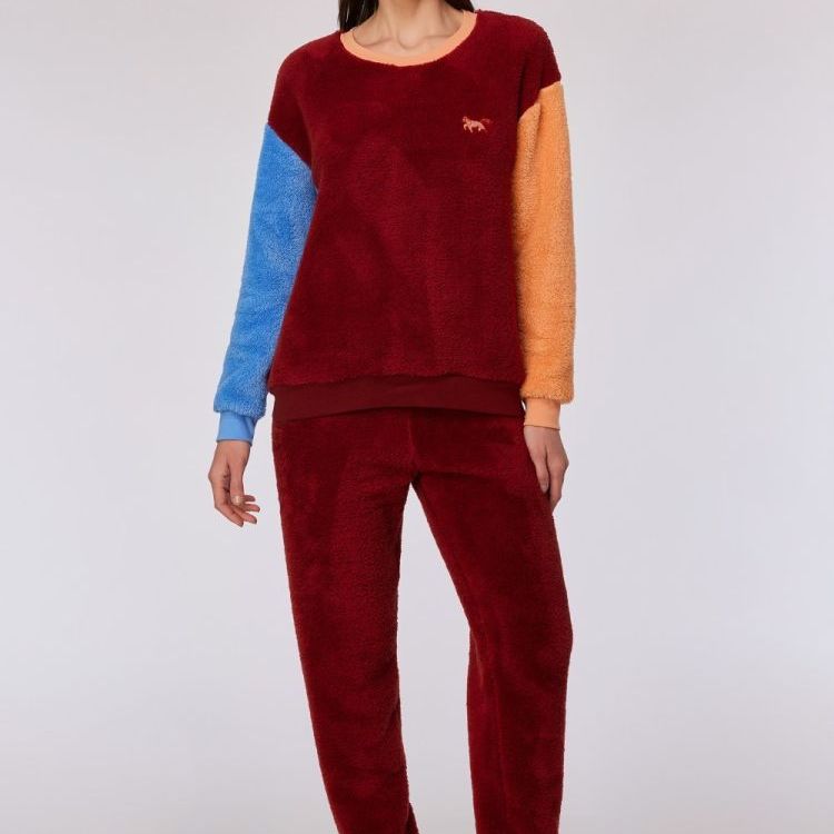 Donkerrode pyjama met sweater en broek met ponyprint in rekbaar katoen