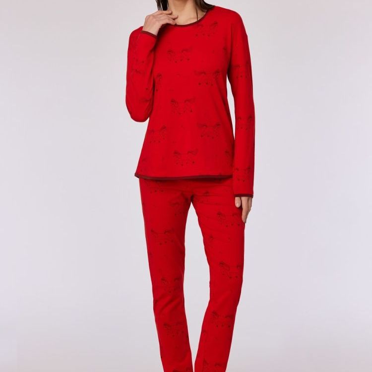 Donkerrode pyjama met sweater en broek met ponyprint in rekbaar katoen