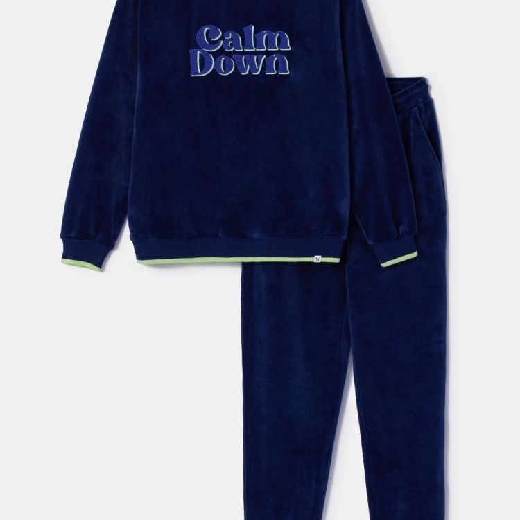 Blauwgrijze pyjama in velours met gestreepte broek en kat