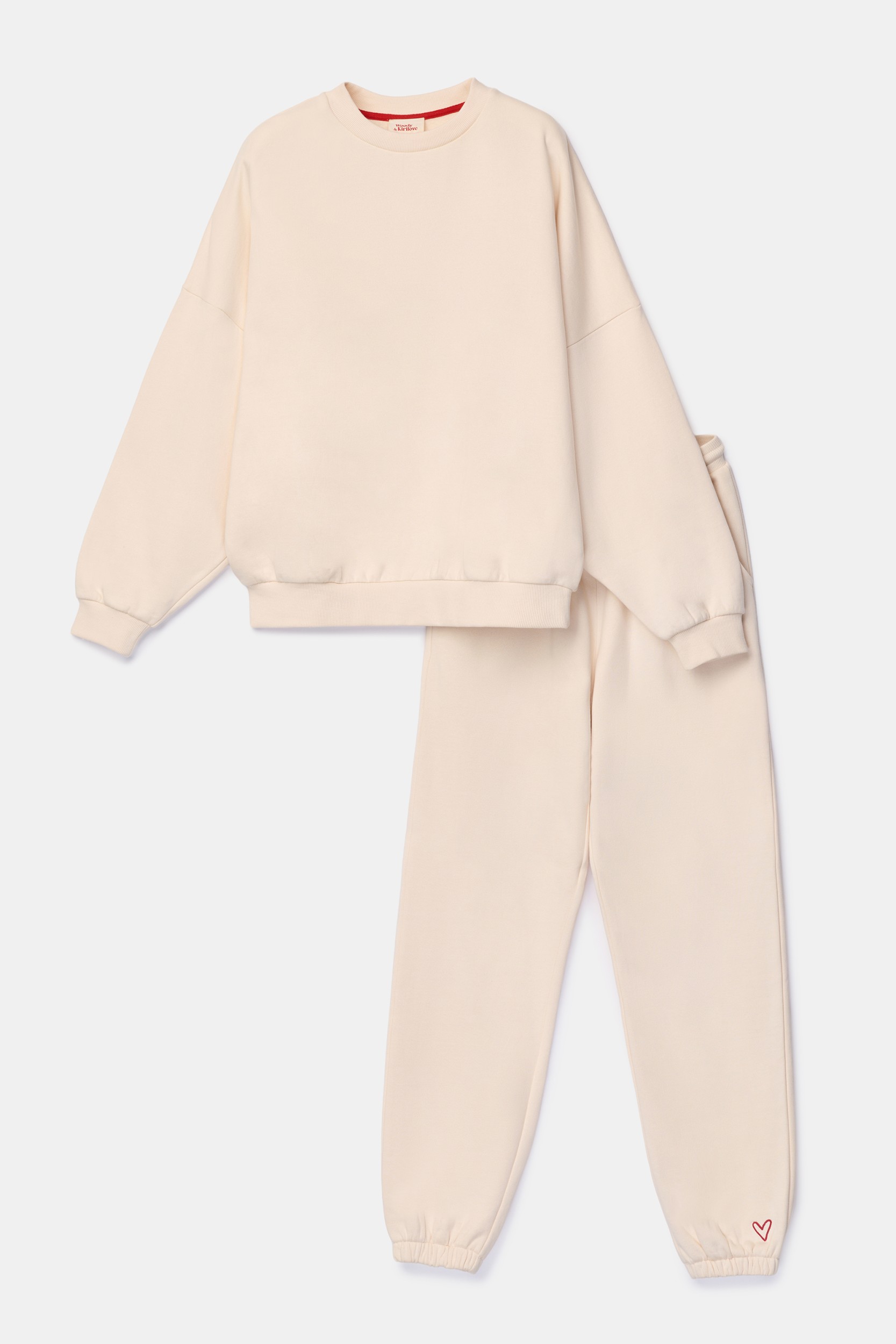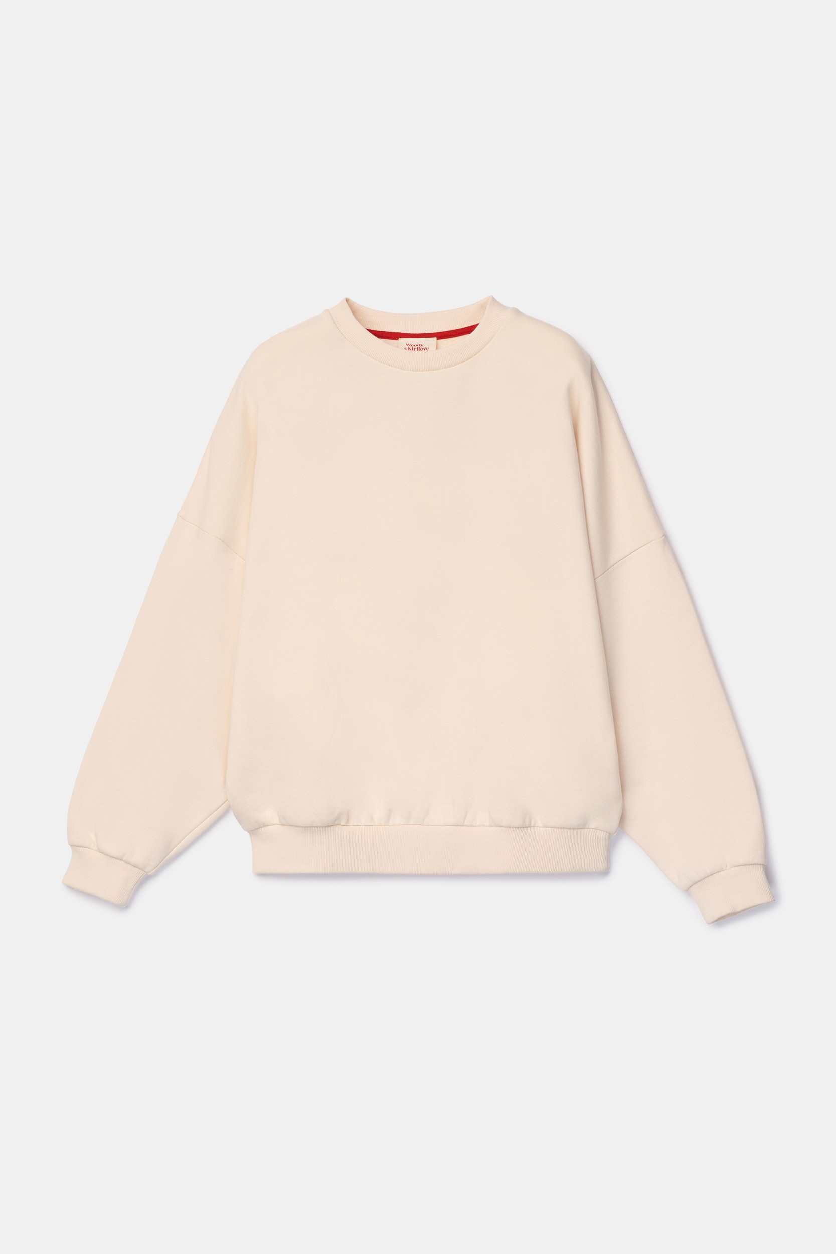 253-18-WKI-K/110Ecru oversized sweater van joggingstof. De sweater heeft de tekst 'More Amor Por Favor' op de achterkant. Verkrijgbaar in de maten 12y-XXL. Uit de Woody & Kirilove collectie: een unieke samenwerking waarin de kwaliteit en het comfort van Woody wordt gecombineerd met de fashionable touch van Yelena en Eloise, de dochters van Tiany Kirilove.