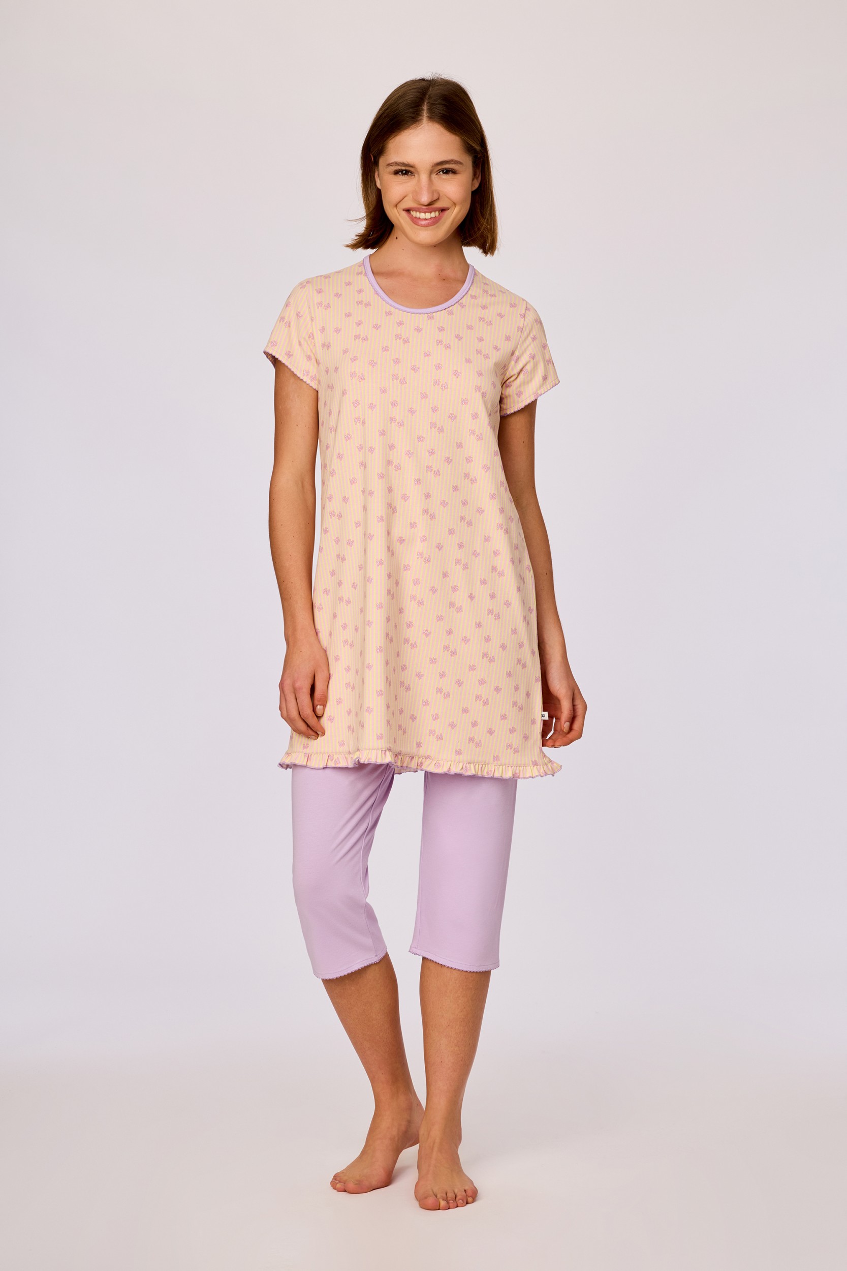 Tweedelige meisjes en dames pyjamaset van soepel katoen. Het lang roze-geel gestreepte shirt heeft een bloemetjesprint en is afgewerkt met glitters. Deze zomerse tuniek heeft korte mouwen en is onderaan afgewerkt met ruches. De tuniek wordt gecombineerd met een effen lila driekwart broek met elastische tailleband. Verkrijgbaar in maten 2Y-XXL.