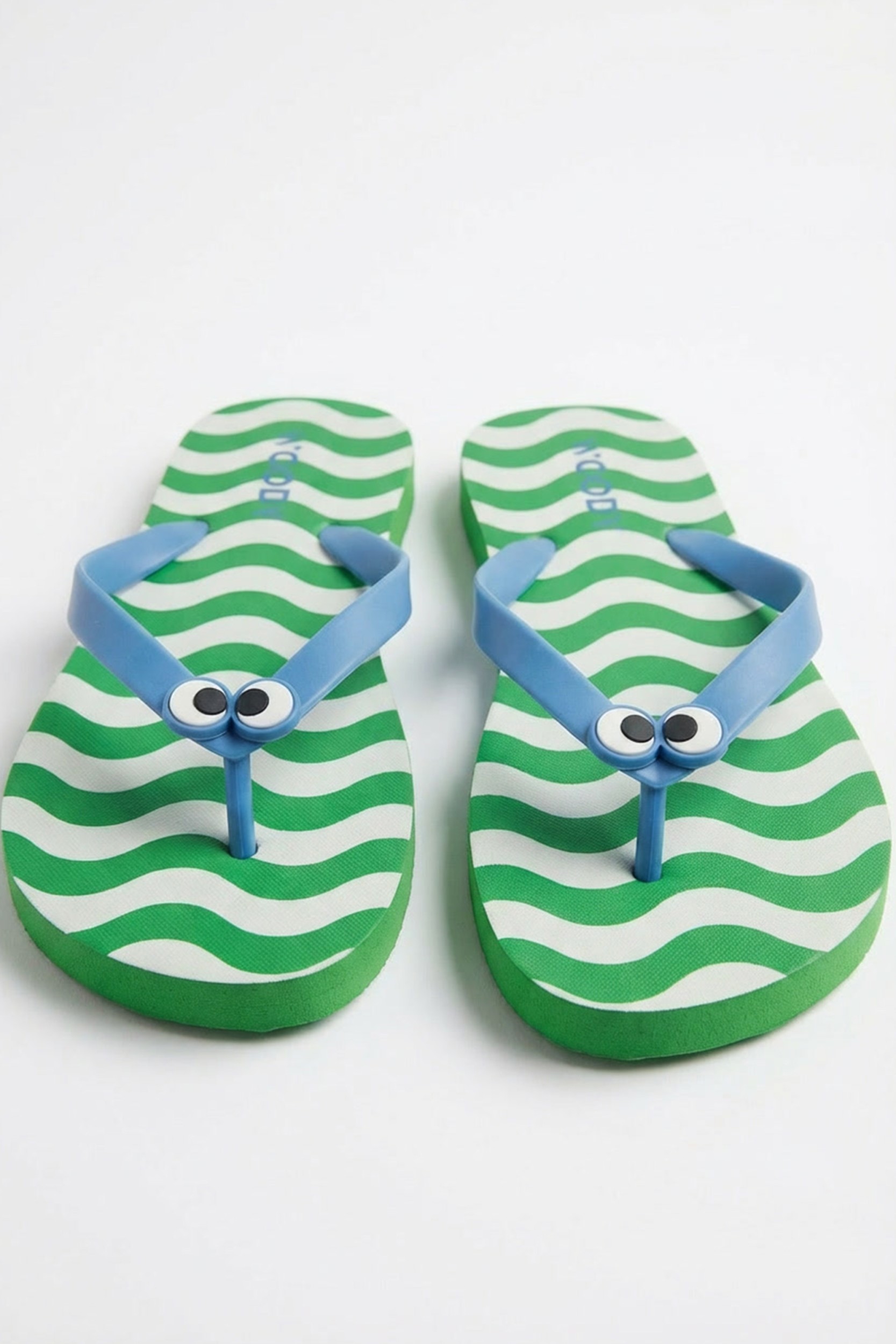 Groen-blauwe teenslipper met Woody-ogen. Het voetbed is voorzien van een golvend streeppatroon in contrasterende kleuren. Geschikt voor gebruik aan strand of zwembad. Verkrijgbaar in maten 33/34 tot 43/44.