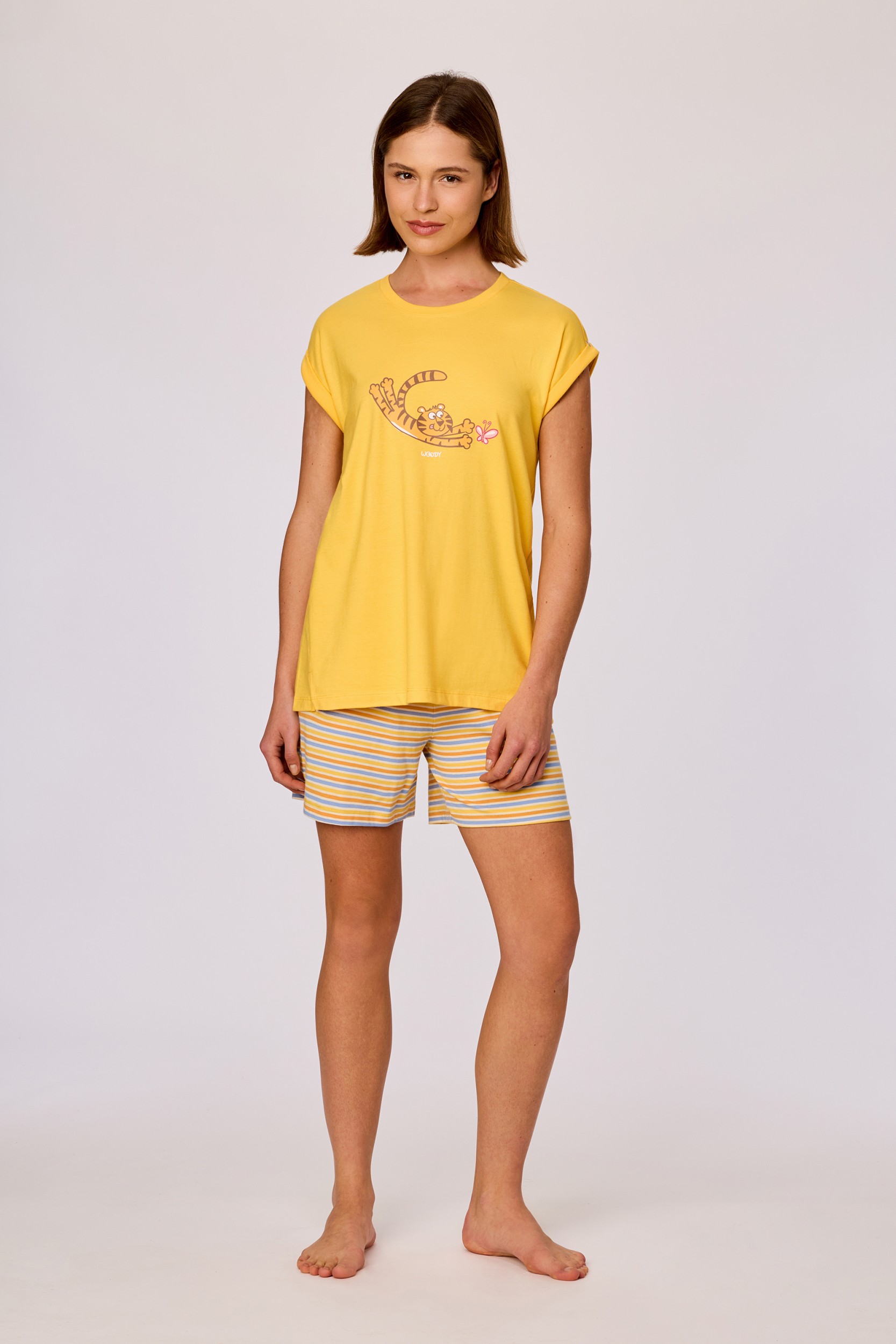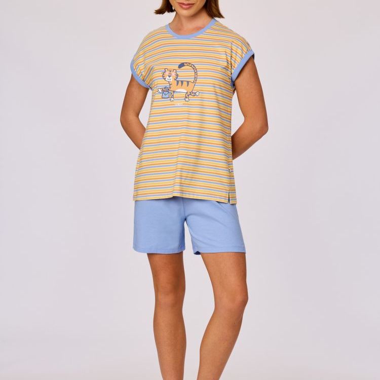 Kleurrijke pyjama voor meisjes en dames van soepel katoen. Het effen gele bovenstuk heeft korte mouwen en een grote leeuw als print. De pyjama wordt gecombineerd met een kleurrijke gestreepte short. Verkrijgbaar in maten 3M-XXL.
