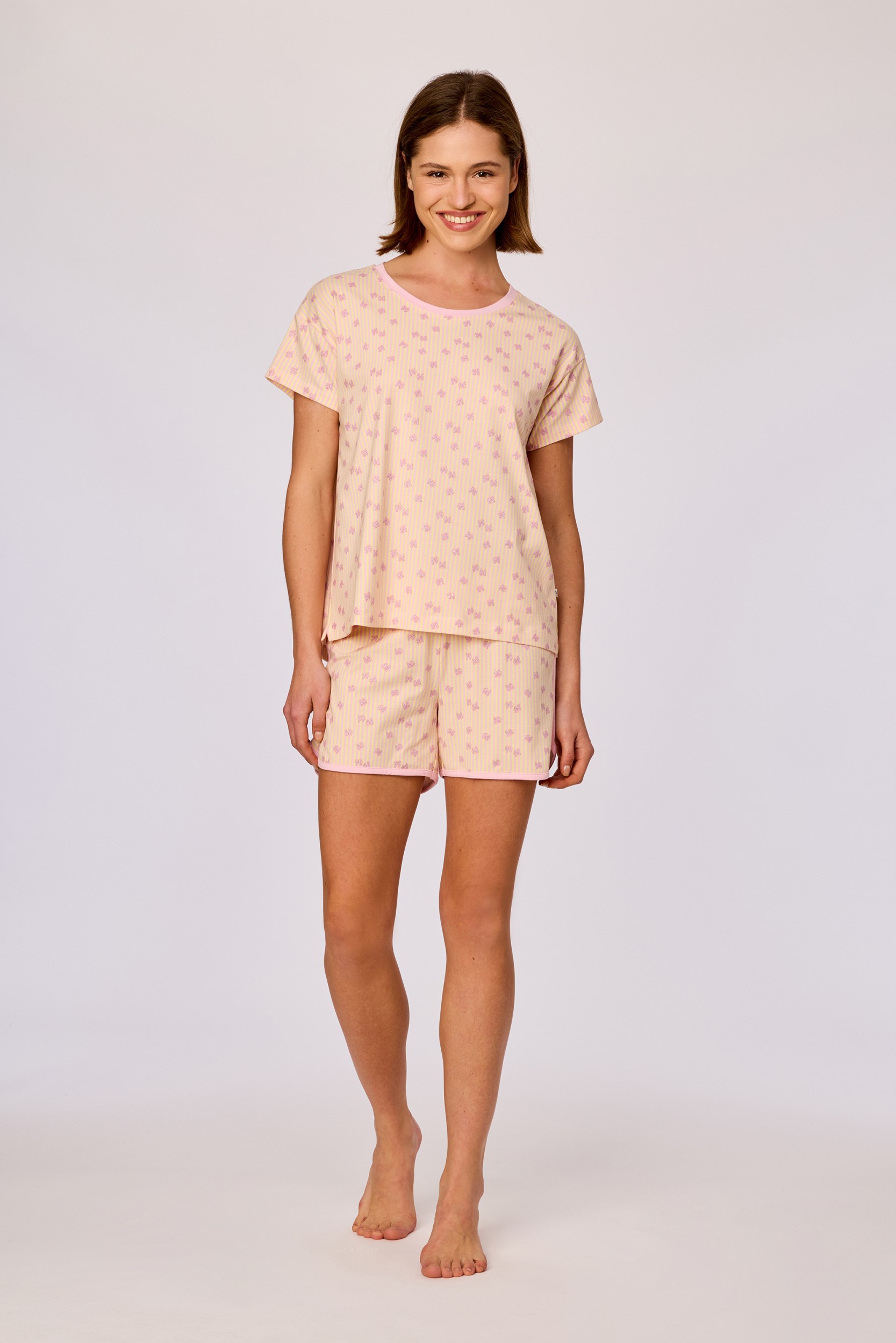261-10-PZG-Z/903Meisjes en dames pyjama van soepel katoen. De geel gestreepte set met vlinderprint en korte mouwen heeft een short in sportieve stijl, afgewerkt met een contrasterende bies. Verkrijgbaar in de maten 3M-XXL.