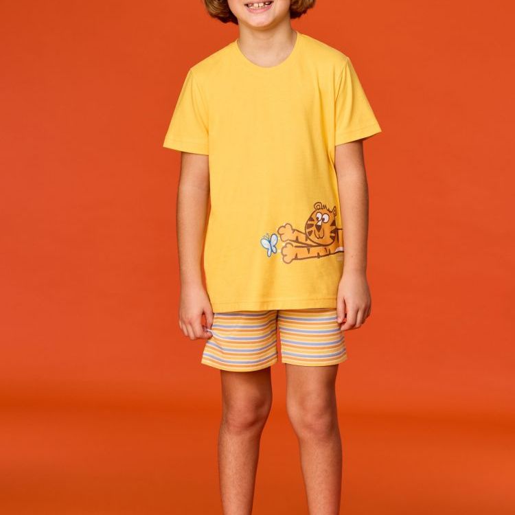 Meisjes en dames pyjama van soepel katoen. Het lila bovenstuk met korte mouwen valt op door de grote kameleonprint. Het bovenstuk wordt gecombineerd met een lila short in sportieve stijl, afgewerkt met een contrasterende bies. Verkrijgbaar in de maten 3M-XXL.