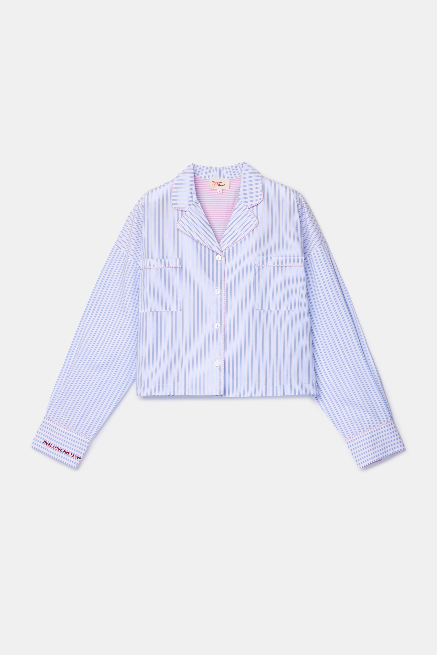 Pyjama met blauw en wit streepjespatroon, gemaakt van luchtige hemdstof. Het doorknoopmodel heeft een cropped pyjamashirt, gecombineerd met een losse lange broek. Op de nekzoom staat het geborduurde opschrift more amore por favor. Verkrijgbaar in de maten 12y–XXL. Uit de Woody & Kirilove collectie: een unieke samenwerking waarin de kwaliteit en het comfort van Woody wordt gecombineerd met de fashionable touch van Yelena en Eloise, de dochters van Tiany Kirilove.