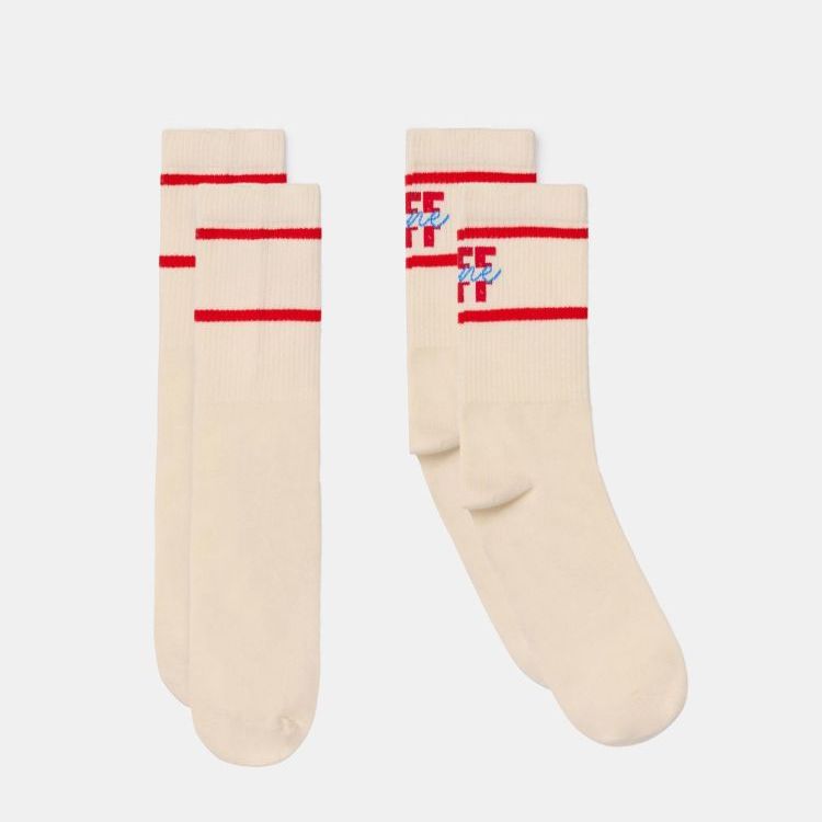 Gebroken witte set sportsokken van fijn katoen. De sokken hebben een rood detail en tekst ter hoogte van de enkels. Verkrijgbaar in de maten 23-26 tot 43-46.