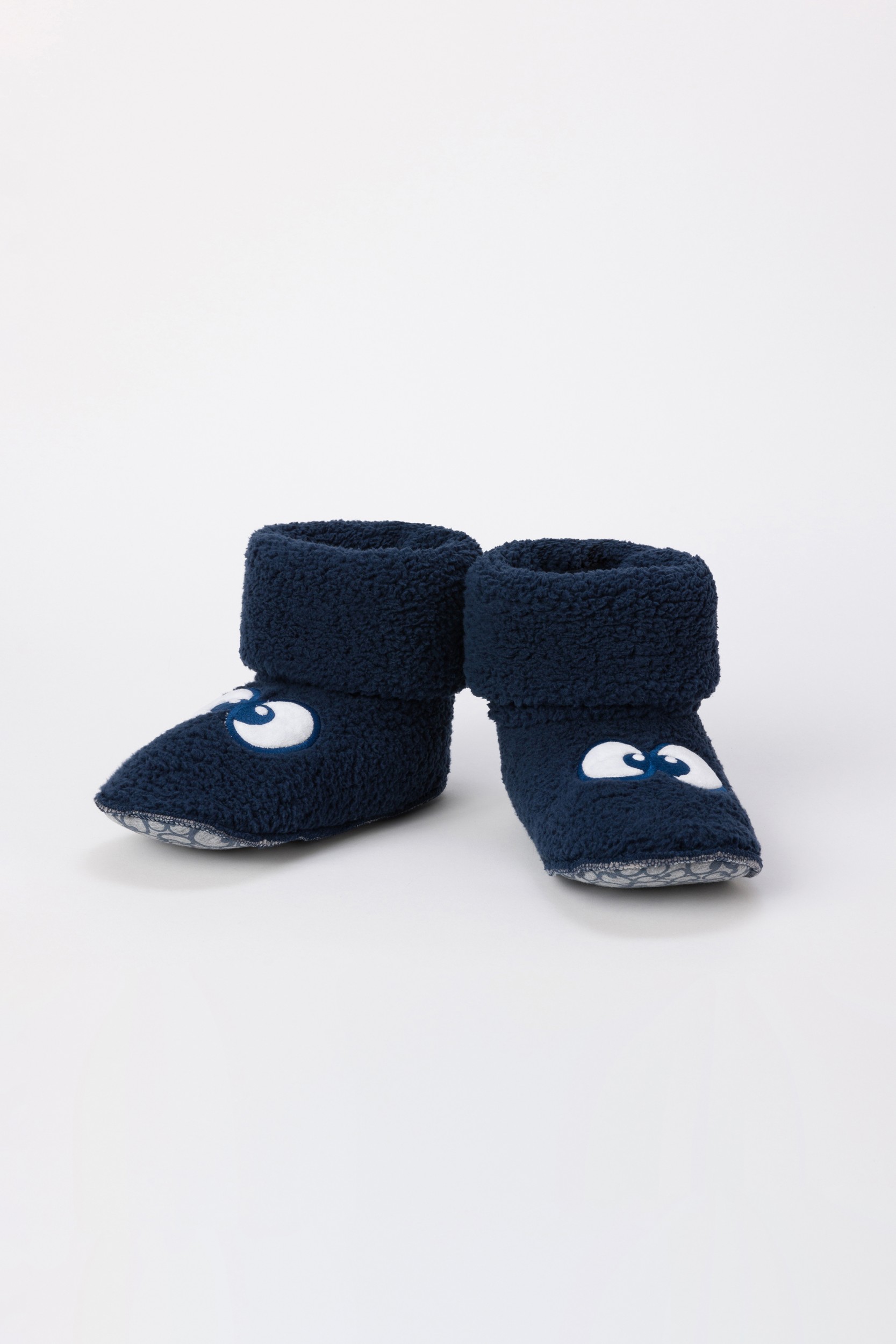 252-10-BOR-M/885Diepblauwe pantoffels in teddystof met ogen. De pantoffels kunnen omgeplooid of lang gelaten worden. Verkrijgbaar in de maten 22-26 tot 43-46.