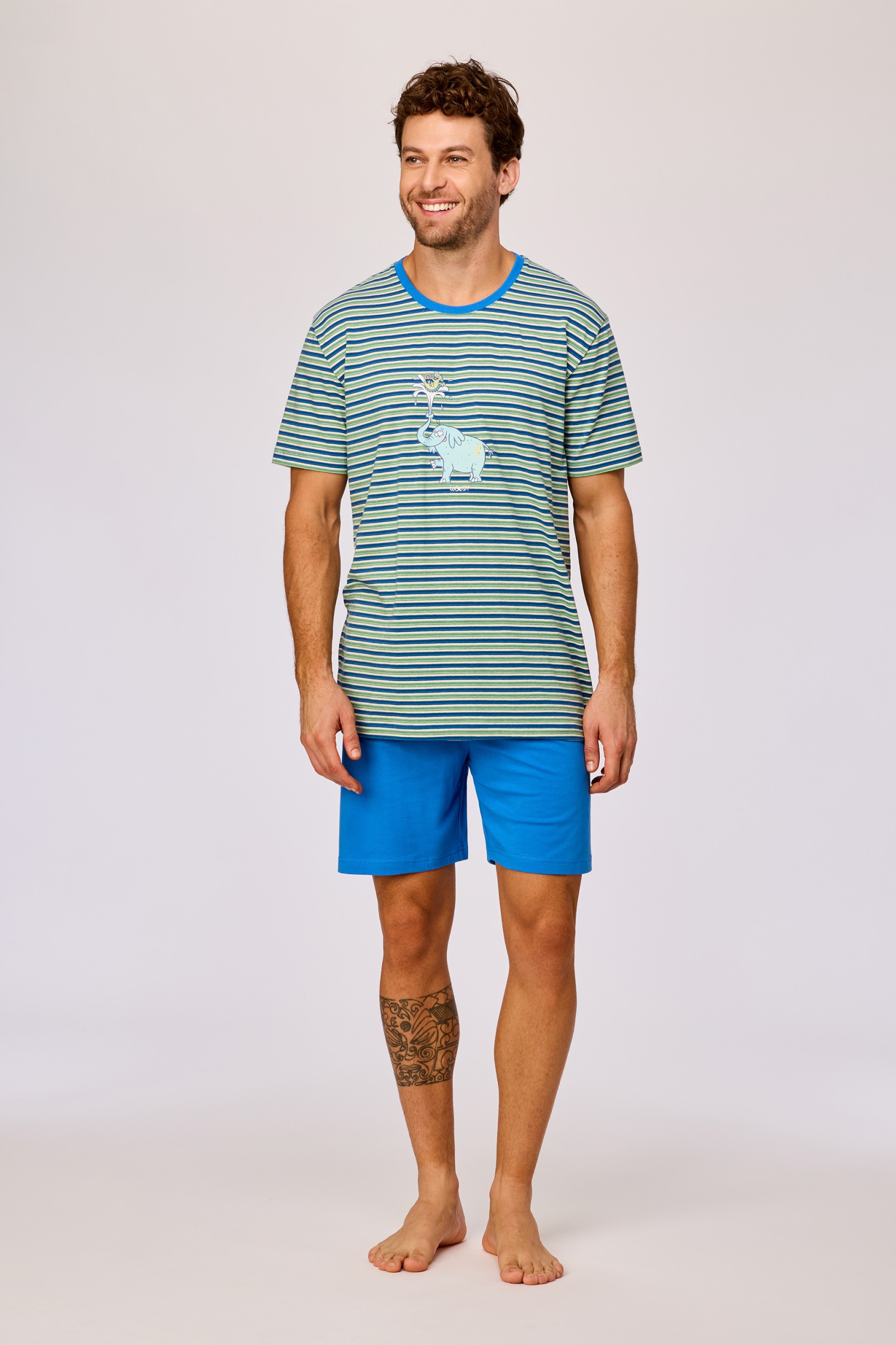 261-10-PSS-Z/908Jongens en heren pyjama van soepel katoen. Het blauw gestreepte bovenstuk valt op door de grote vrolijke glow-in-the-dark dierenprint. Het bovenstuk wordt gecombineerd met een effen blauwe short. Verkrijgbaar in de maten 3M-XXL.