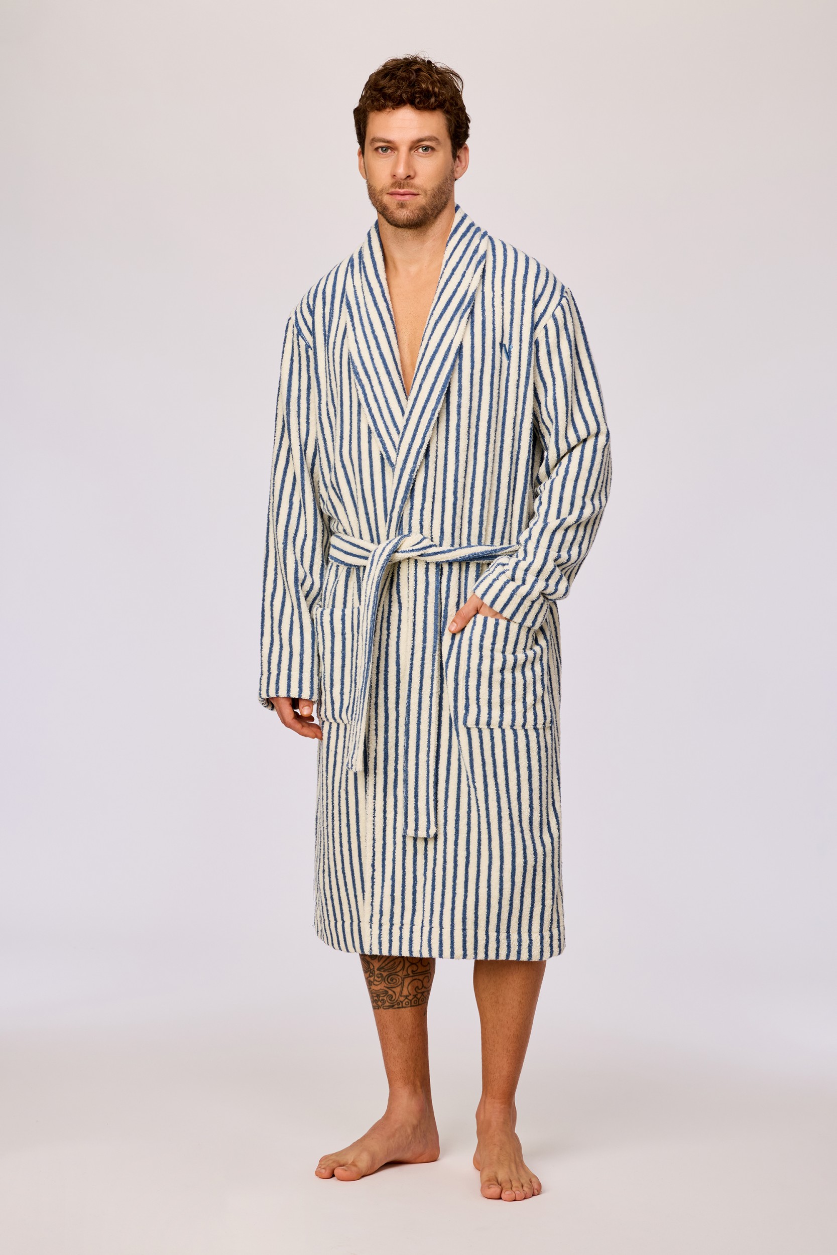 261-10-MDS-B/918Blauw-wit gestreepte kamerjas van zware badstof voor heren. Dit model valt tot net onder de knie, heeft 2 ruime zakken vooraan en sluit met een ceintuur. Verkrijgbaar in de maten S-XXL.