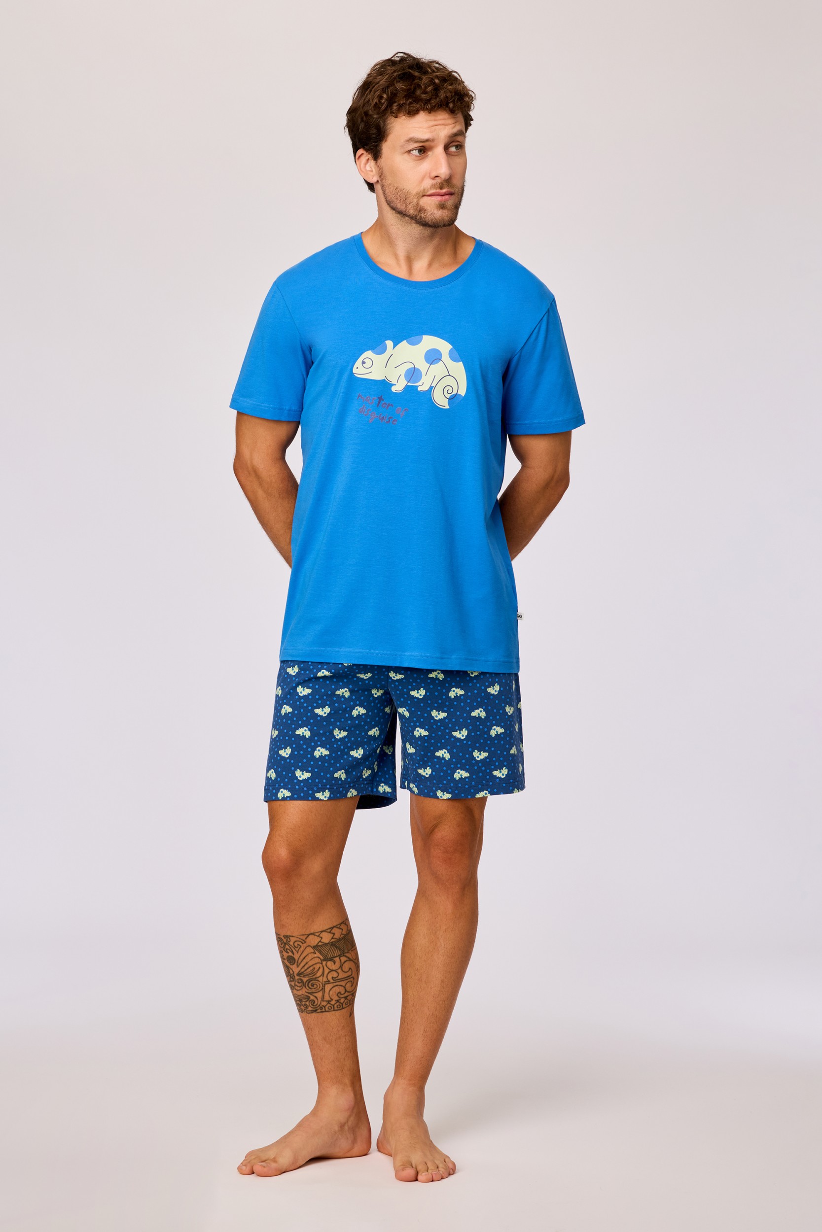 261-10-PZA-Z/837Jongens en heren pyjama van soepel katoen. Het blauwe bovenstuk wordt gecombineerd met een blauwe short met bolletjesprint. Beide hebben een kameleonprint Verkrijgbaar in de maten 3M-XXL.