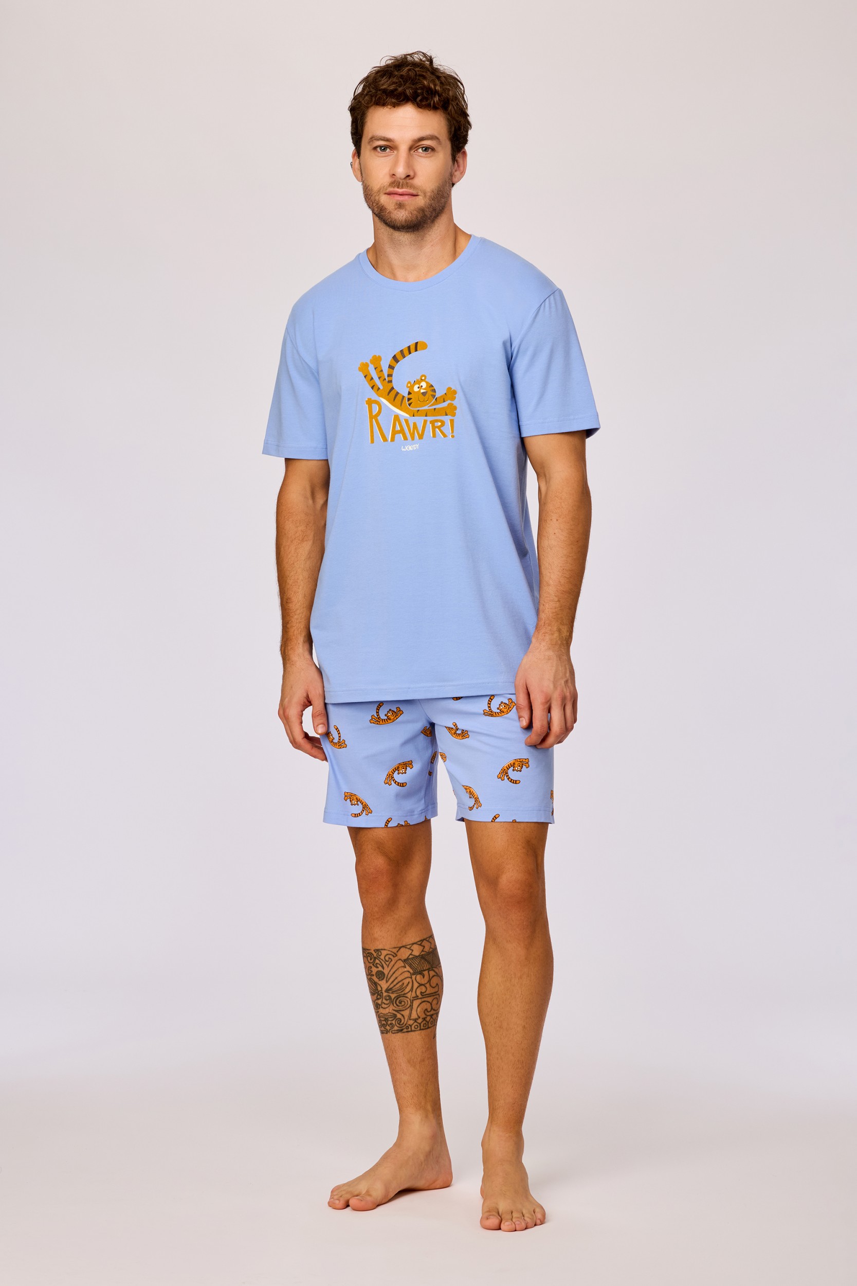 Jongens en heren pyjama van soepel katoen. Het effen blauwe bovenstuk valt op door de grote vrolijke tijgerprint. Het bovenstuk wordt gecombineerd met een blauwe short met tijgerprint. Verkrijgbaar in de maten 3M-XXL.
