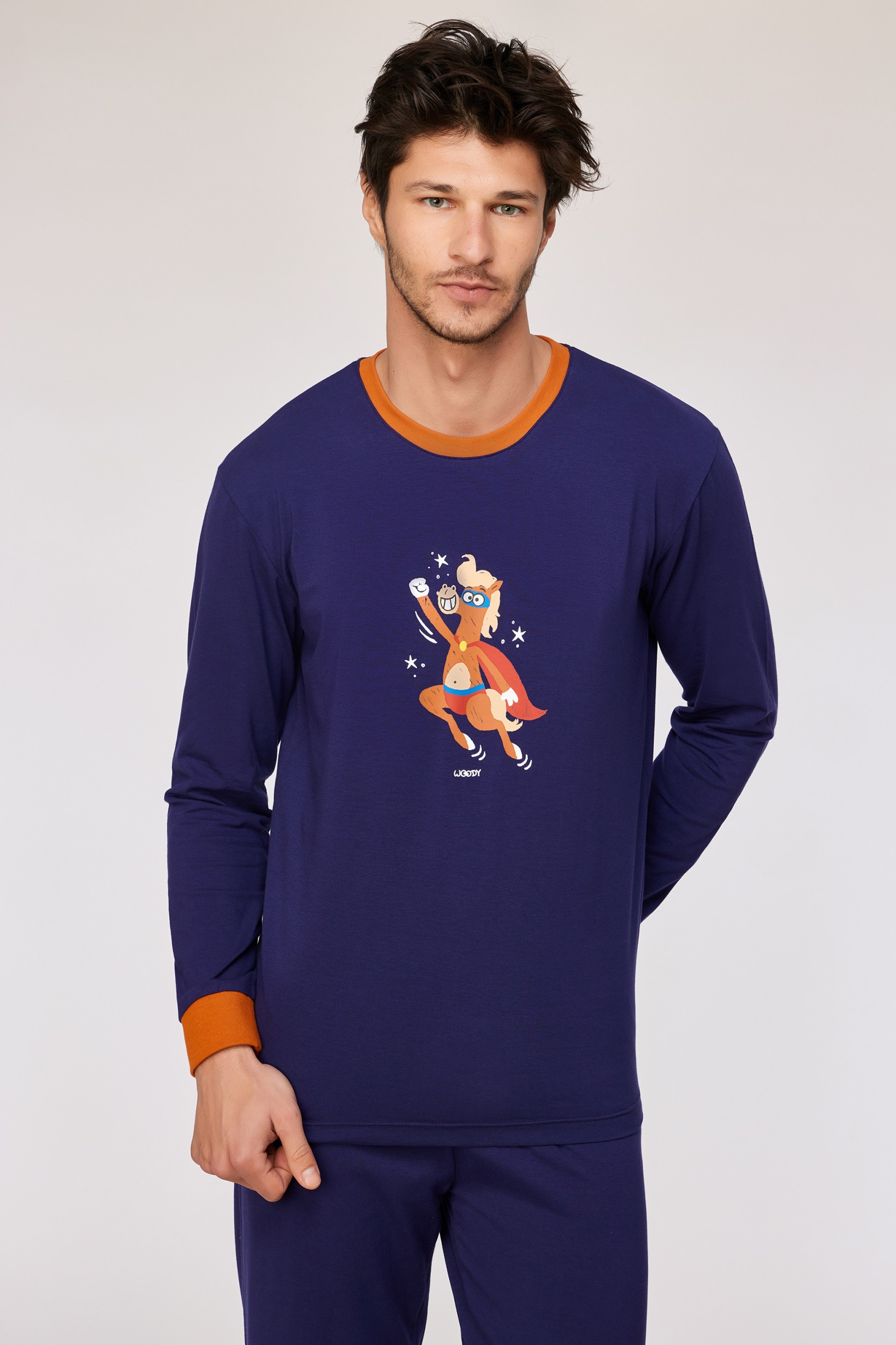 Donkerblauwe pyjama van soepel katoen. Op het bovenstuk staat een grote pony die je zowel op de voor- als achterkant kunt vinden. De mouwuiteinden, hals en pijpuiteinden zijn in een contrasterende oranje/bruine kleur. De pyjama is verkrijgbaar in de maten 24m/2Y-XXL.