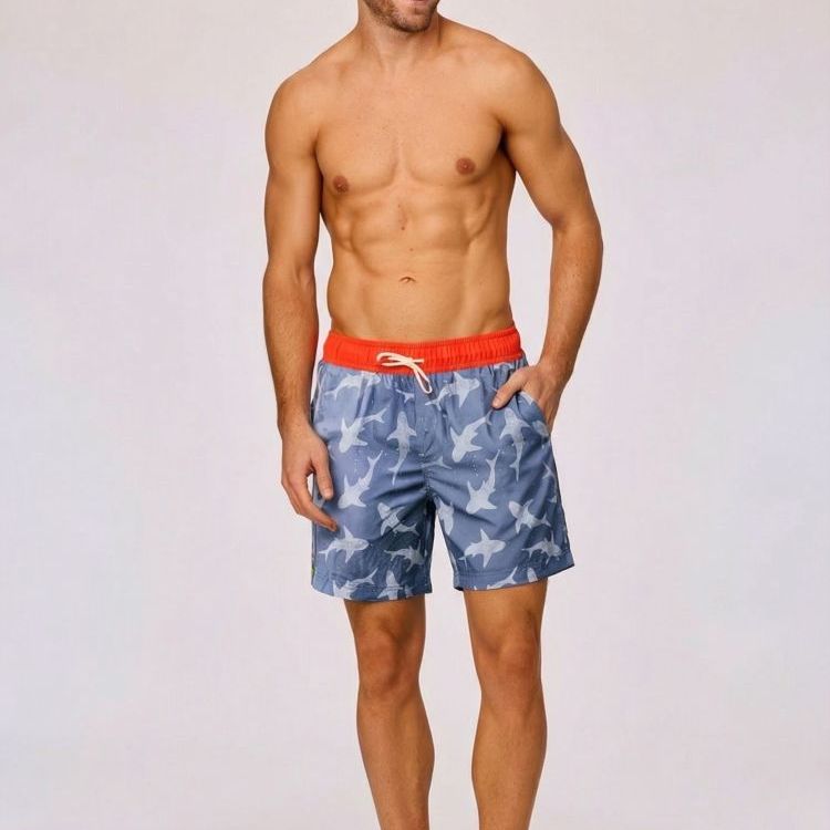Zwemshort voor jongens en heren uitgevoerd in een donkerblauwe kleur met een all over haaienprint. De short heeft een elastische tailleband in contrasterend rood met een trekkoord. Het model heeft een rechte pijpafwerking. De zwemshort is voorzien van steekzakken aan de zijkant en een achterzak. Beschikbaar in de maten 2Y-XXL.