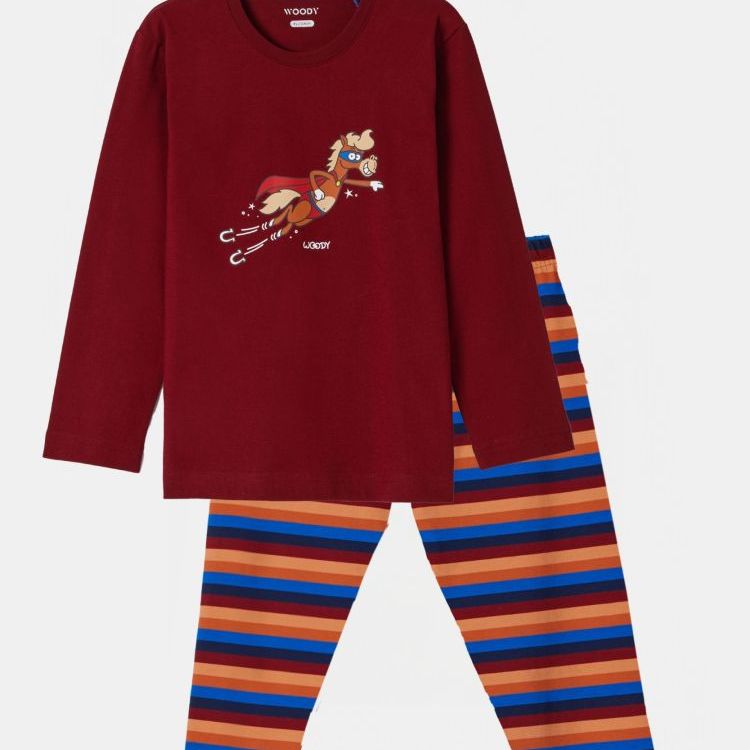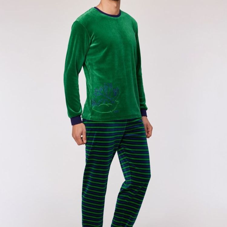 252-10-PLC-V/792Donkergroene pyjama van velours. Het bovenstuk met de mouwboorden en hals in een contrasterende blauwe kleur heeft een print van een duif. De broek is blauw-groen gestreept. De pyjama is verkrijgbaar in de maten 0m-XXL en heeft een schoudersluiting bij de maten 0-18m.