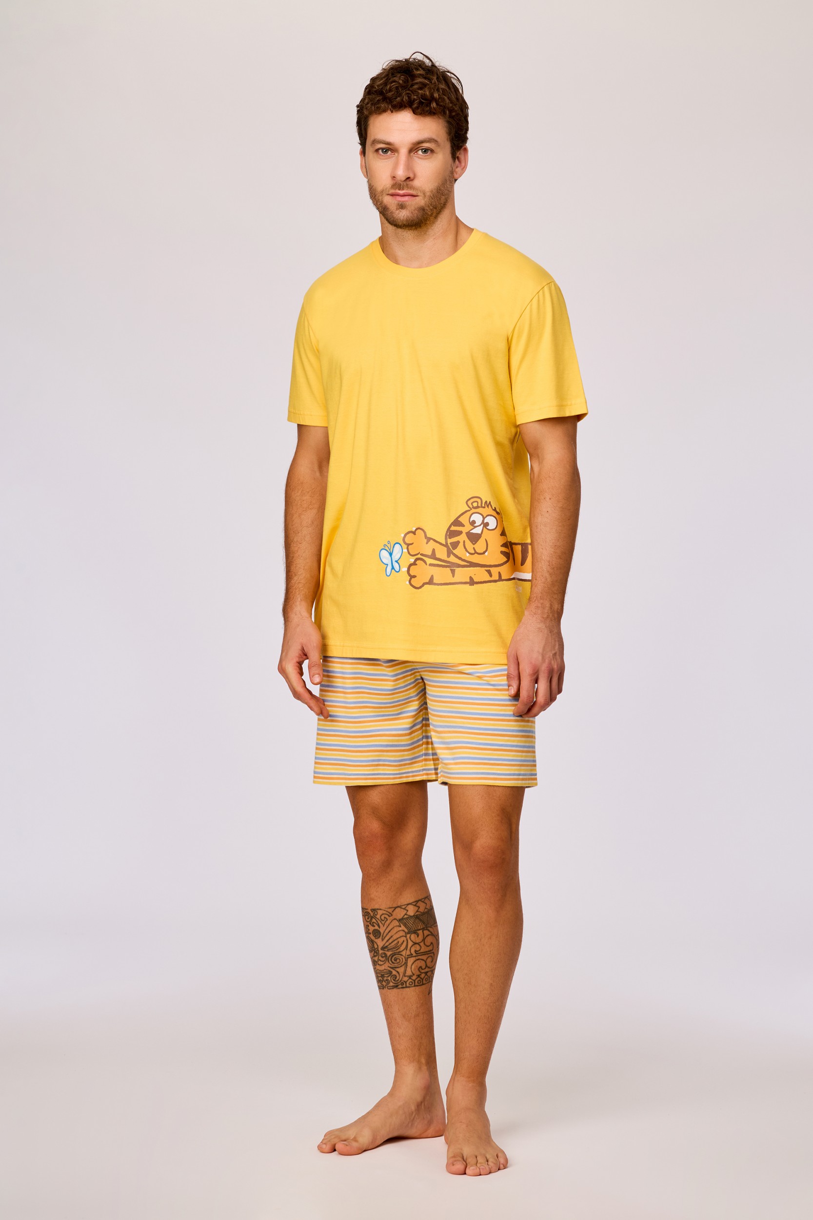 261-10-PSU-S/650Jongens en heren pyjama van soepel katoen. Het effen gele bovenstuk valt op door de grote vrolijke tijgerprint. Het bovenstuk wordt gecombineerd met een kleurrijk gestreepte short. Verkrijgbaar in de maten 3M-XXL.