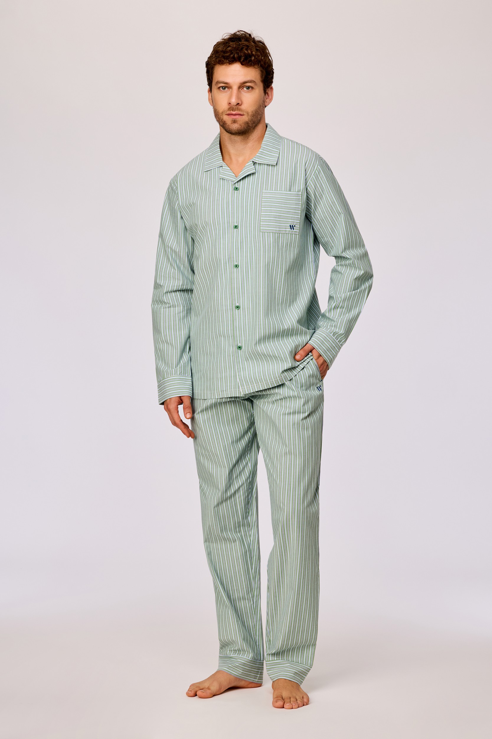 261-10-QWA-W/929Groene jongens en heren pyjama van geweven katoen. De pyjama bestaat uit een pyjamahemd met lange mouwen en een bijpassende lange broek. Het hemd is uitgevoerd met een omslagkraag, een volledige knoopsluiting aan de voorzijde en een borstzak. De borstzak is afgewerkt met een subtiel logo detail. De lange broek heeft een rechte pijp. De pyjama is uitgevoerd in een groen gestreept patroon dat zowel op het shirt als op de broek terugkomt. De manchetten van de mouwen en de broekspijpen zijn afgewerkt met een rechte zoom. Beschikbaar in de maten 4Y-XXL.