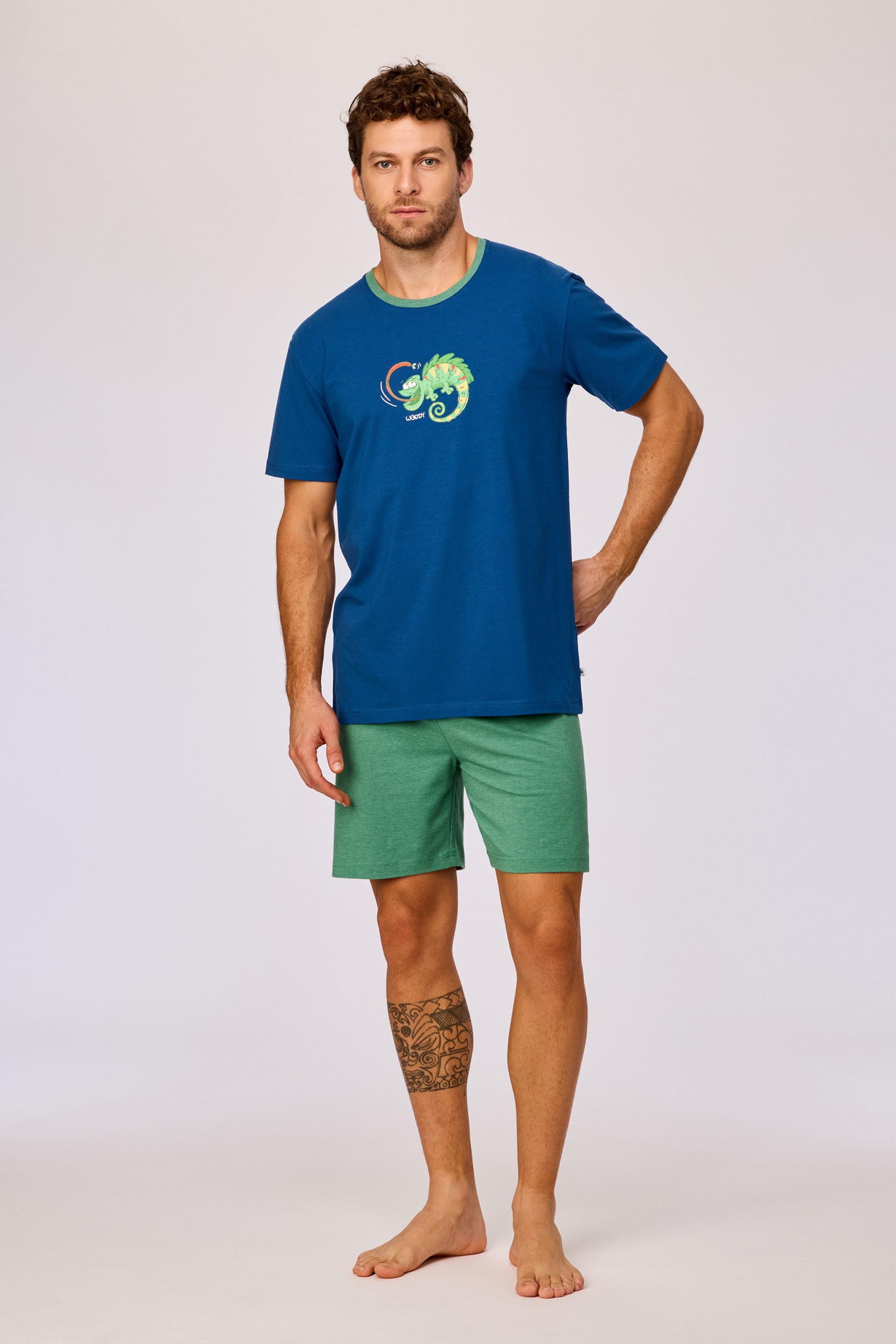 261-10-PUS-Z/887Jongens en heren pyjama van soepel katoen. Het effen donkerblauwe bovenstuk valt op door de grote vrolijke kameleonprint. Het bovenstuk wordt gecombineerd met een effen groene short. Verkrijgbaar in de maten 3M-XXL.