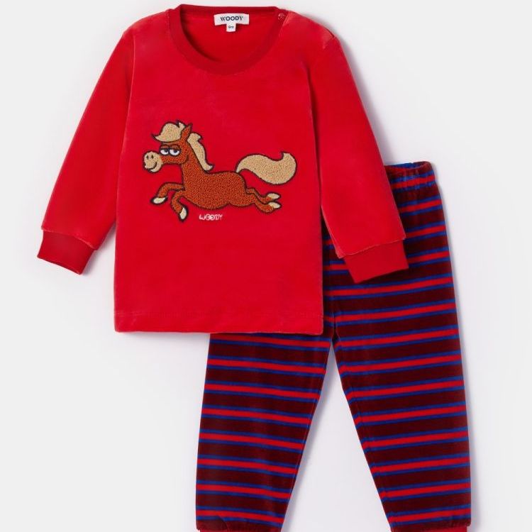 252-10-PLC-V/489Rode pyjama van velours. Het bovenstuk is rood met een print van een pony. De broek is rood-blauw gestreept. De pyjama is verkrijgbaar in de maten 0m-XXL en heeft een schoudersluiting bij de maten 0-18m.