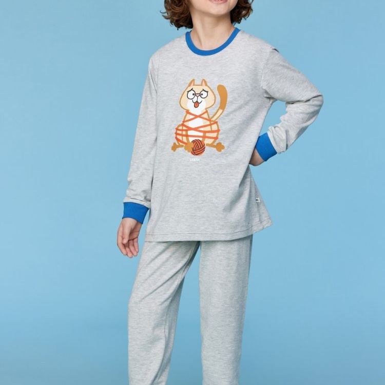 252-10-PLC-Z/925Blauw-geel gestreepte pyjama van soepel katoen. Er is een kleine kattenprint te vinden onderaan het bovenstuk en op de rug. De mouwuiteinden, hals en pijpuiteinden zijn blauw. De pyjama is verkrijgbaar in de maten 0m-XXL en heeft een schoudersluiting bij de maten 0-18m.