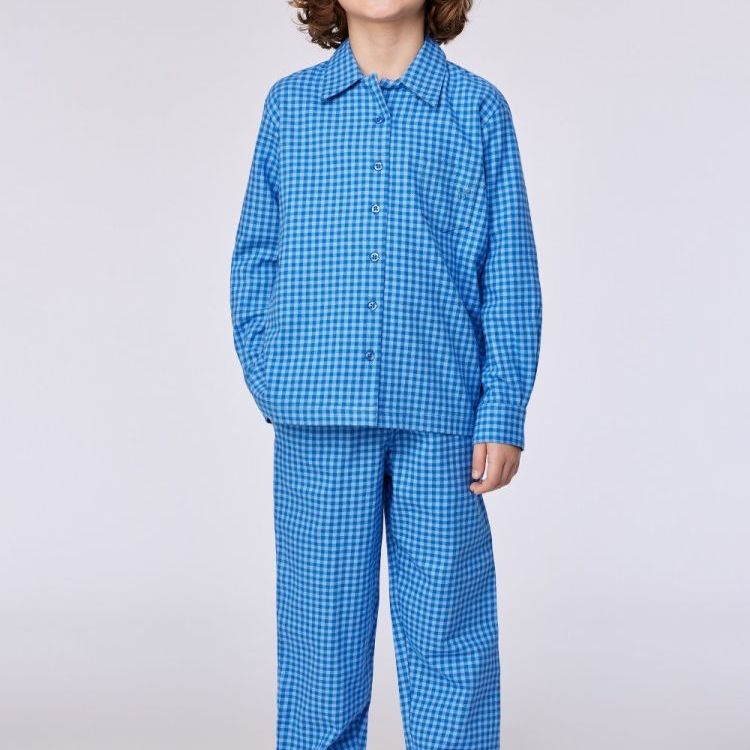 Pyjama van blauw geweven katoen. De pyjama is geruit en de broek heeft zakken. Verkrijgbaar in de maten 24m/2y-XXL.