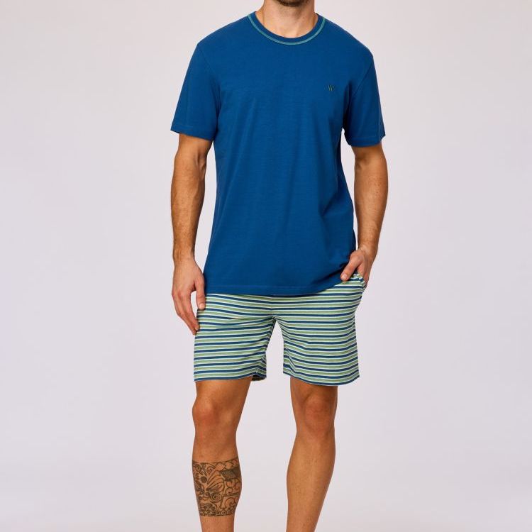 261-10-QPB-Z/887Jongens en heren pyjamaset bestaande uit een effen T-shirt en een short van rekbaar en soepel katoen. Het blauwe T-shirt heeft korte mouwen, een ronde hals met een contrasterende afwerking en een klein logo op borsthoogte. De gestreepte short heeft een horizontaal streeppatroon in meerdere tinten, een elastische tailleband met aantrekkoord en een rechte pijp. De achterzijde van de short is uitgevoerd in hetzelfde streeppatroon. Beschikbaar in de maten 2Y-XXL.