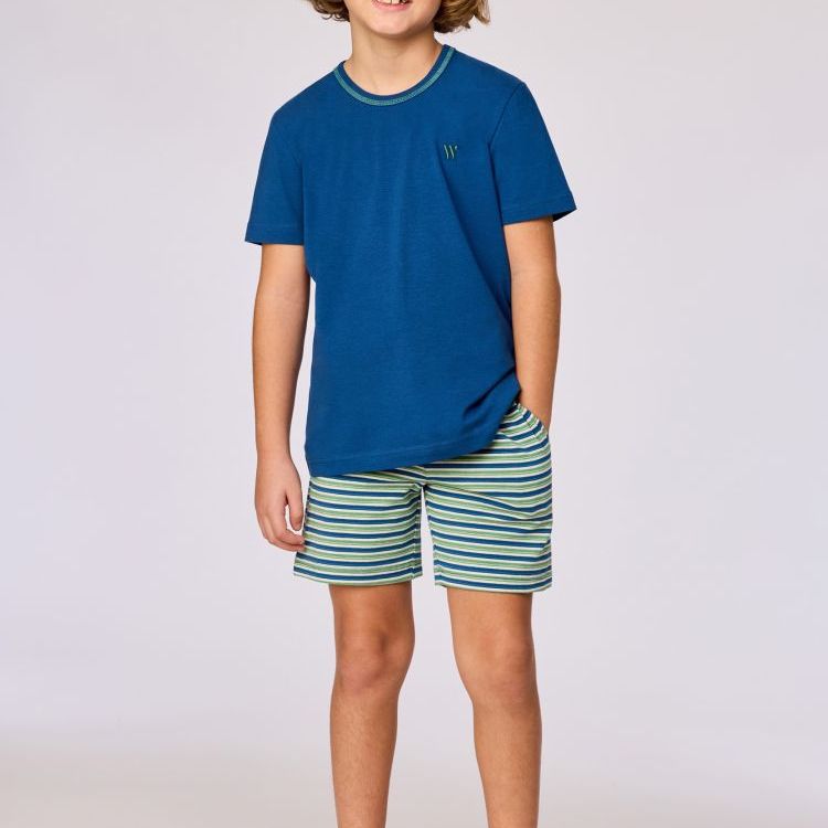 Jongens en heren pyjamaset bestaande uit een effen T-shirt en een short van rekbaar en soepel katoen. Het blauwe T-shirt heeft korte mouwen, een ronde hals met een contrasterende afwerking en een klein logo op borsthoogte. De gestreepte short heeft een horizontaal streeppatroon in meerdere tinten, een elastische tailleband met aantrekkoord en een rechte pijp. De achterzijde van de short is uitgevoerd in hetzelfde streeppatroon. Beschikbaar in de maten 2Y-XXL.