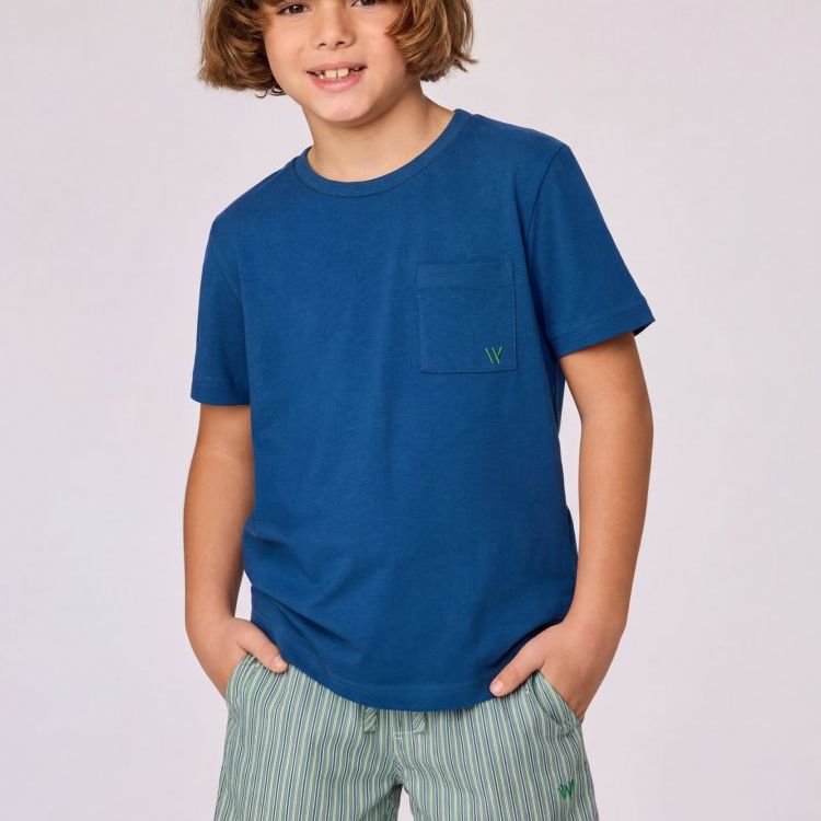 Jongens en heren pyjama bestaande uit een T-shirt en een bijpassende short van geweven katoen. Het blauwe T-shirt heeft korte mouwen, een ronde hals en een borstzak. De short is groen-blauw gestreept, heeft een elastische tailleband en aantrekkoord. Beschikbaar in de maten 4Y-XXL.