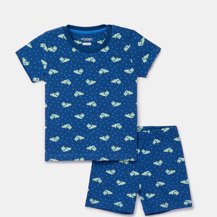 Jongens en heren pyjama bestaande uit een T-shirt en een bijpassende short van rekbaar en soepel katoen. Het T-shirt heeft korte mouwen, een ronde hals met contrasterende boord en een all over patroon van palmbomen in blauwtinten. Op de borst is een klein geborduurd logo aangebracht. De short is uitgevoerd in effen blauw en heeft een elastische tailleband met aantrekkoord en een rechte pijp. Beschikbaar in de maten 2Y-XXL.