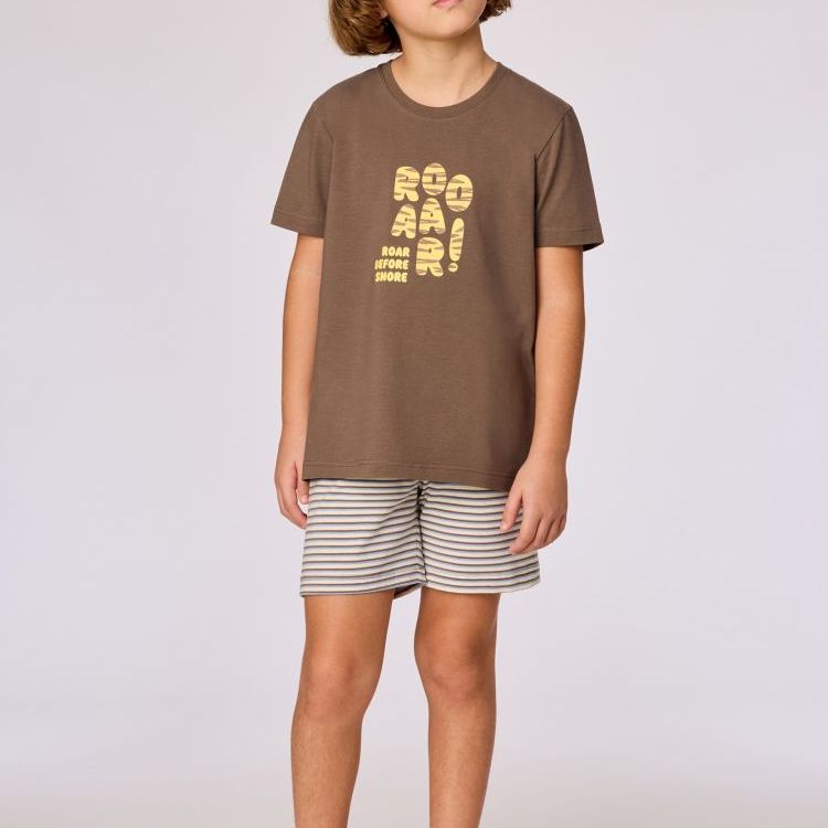 261-10-QPB-Z/912Jongens en heren pyjama bestaande uit een T-shirt en een bijpassende short van rekbaar en soepel katoen. Het T-shirt heeft korte mouwen, een ronde hals met contrasterende boord en een all over patroon van palmbomen in blauwtinten. Op de borst is een klein geborduurd logo aangebracht. De short is uitgevoerd in effen blauw en heeft een elastische tailleband met aantrekkoord en een rechte pijp. Beschikbaar in de maten 2Y-XXL.
