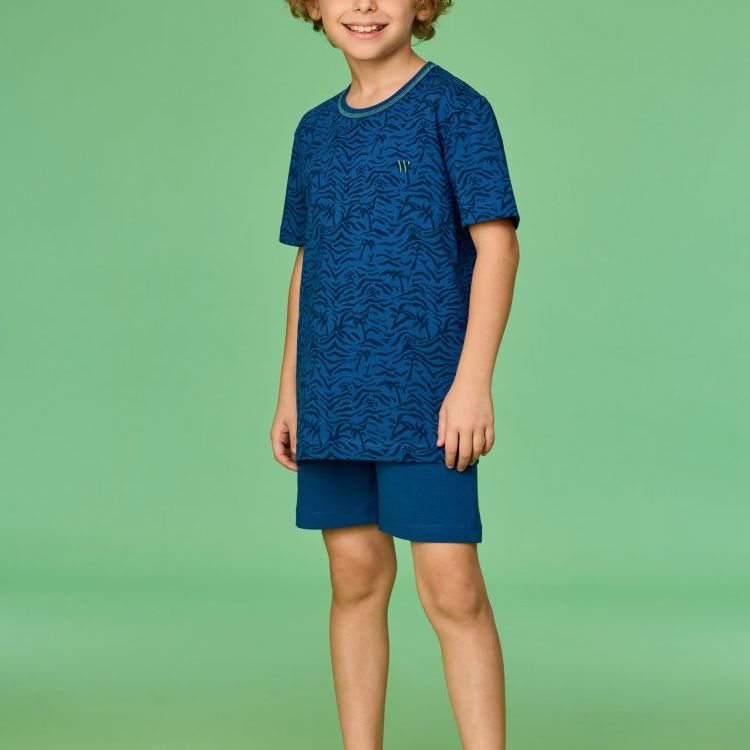 Jongens en heren pyjama van soepel katoen. De set met korte mouwen en een short is donkerblauw met bolletjes en heeft een kameleonprint. Verkrijgbaar in de maten 3M-XXL
