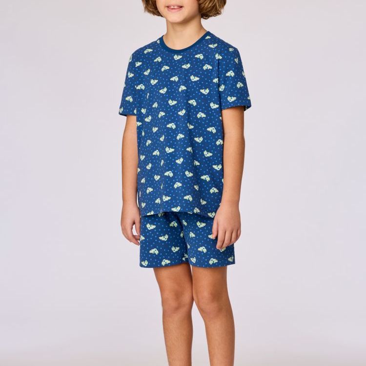 Jongens en heren pyjama bestaande uit een T-shirt en een bijpassende short van rekbaar en soepel katoen. Het T-shirt heeft korte mouwen, een ronde hals met contrasterende boord en een all over patroon van palmbomen in blauwtinten. Op de borst is een klein geborduurd logo aangebracht. De short is uitgevoerd in effen blauw en heeft een elastische tailleband met aantrekkoord en een rechte pijp. Beschikbaar in de maten 2Y-XXL.