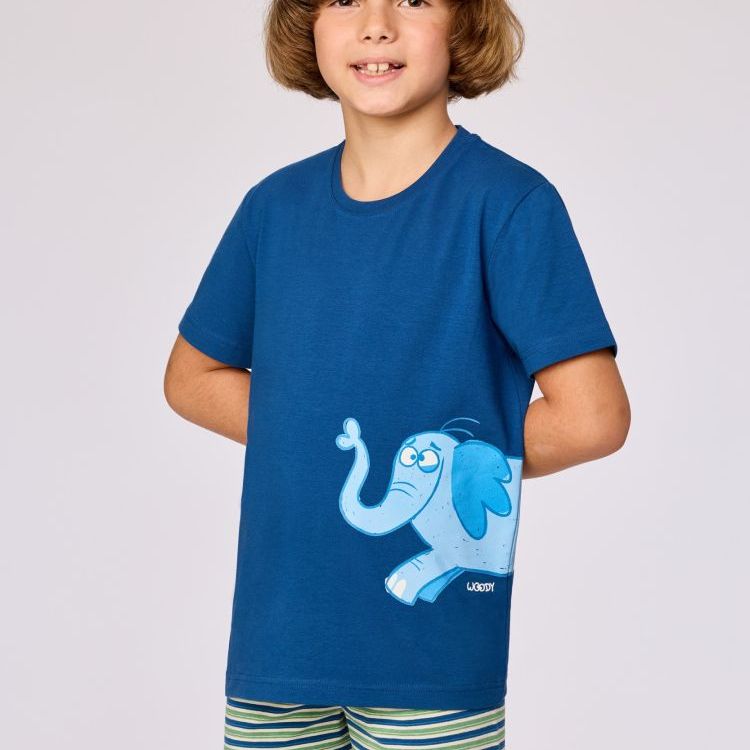 261-10-PSU-Z/887Jongens en heren pyjama van soepel katoen. Het effen donkerblauwe bovenstuk valt op door de grote vrolijke olifantenprint. Het bovenstuk wordt gecombineerd met een kleurrijk gestreepte short. Verkrijgbaar in de maten 3M-XXL.