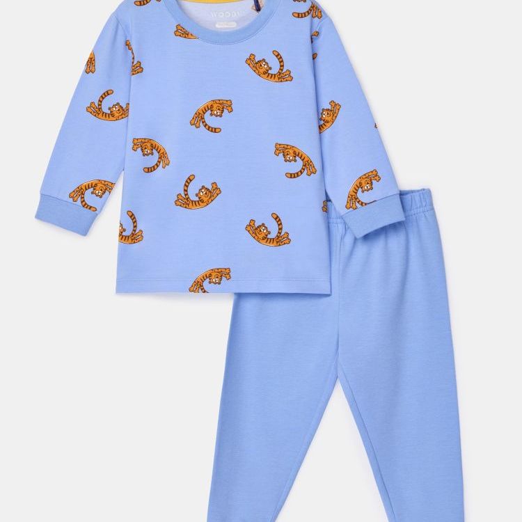 Jongens en heren pyjama van soepel katoen. Het effen blauwe bovenstuk valt op door de grote vrolijke tijgerprint. Het bovenstuk wordt gecombineerd met een blauwe short met tijgerprint. Verkrijgbaar in de maten 3M-XXL.