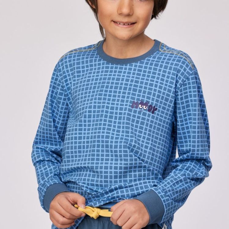 Blauwe pyjama van soepel katoen. Het bovenstuk is grijs met blauwe ruitjes. De broek is effen grijs. Verkrijgbaar in de maten 24/2y-XXL.