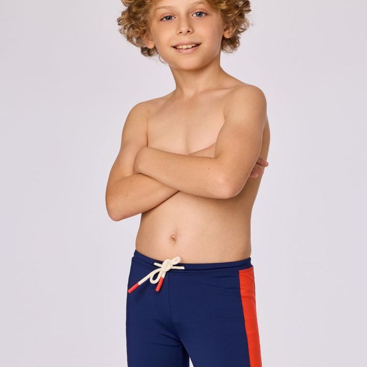 Donkerblauwe aansluitende zwembroek met oranje voor jongens en heren. Het model is afgewerkt met een elastische tailleband en een verstelbaar wit trekkoord aan de voorzijde. De korte pijpen zorgen voor bewegingsvrijheid, terwijl het minimalistische ontwerp geschikt is voor zwemlessen met school of recreatief zwemmen. Verkrijgbaar in de maten 2Y-XXL.
