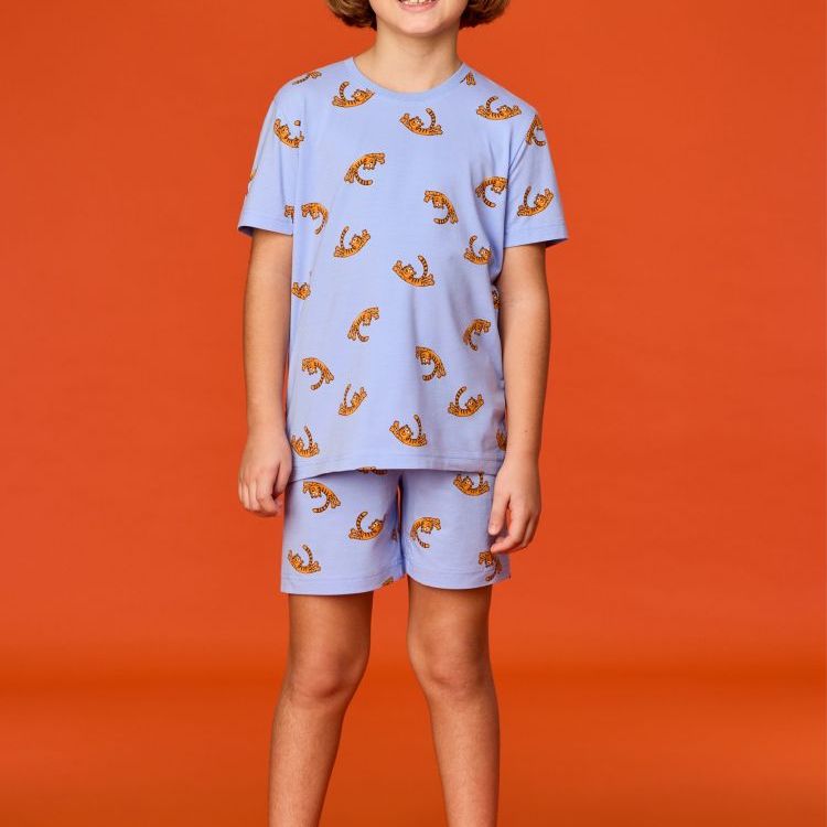 Jongens en heren pyjama van soepel katoen. Het bruin-blauw gestreepte bovenstuk met korte mouwen en een grote print op de rug wordt gecombineerd met een gestreepte short. Verkrijgbaar in de maten 24m2Y-XXL.