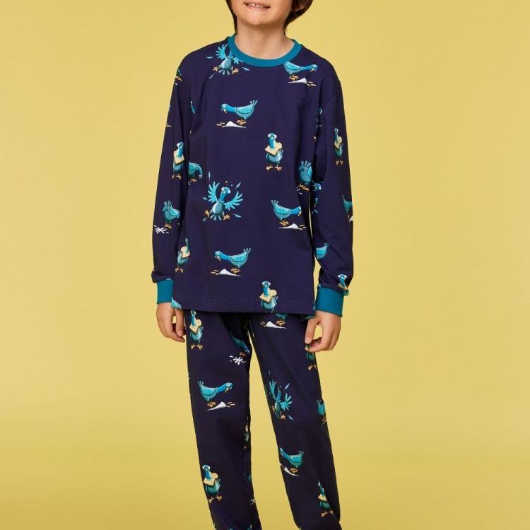 252-10-PLC-Z/930Donkerblauwe pyjama van soepel katoen. Het bovenstuk en de broek hebben een volledige duivenprint. De mouwuiteinden, hals en pijpuiteinden zijn in een lichter blauw. De pyjama is verkrijgbaar in de maten 0m-XXL en heeft een schoudersluiting bij de maten 0-18m.