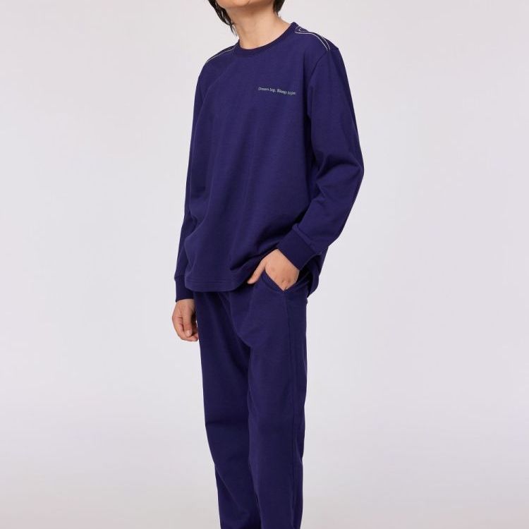 Donkerblauwe pyjama van soepel katoen. Het bovenstuk heeft de tekst 'Dream big. Sleep bigger' en op de rug 'Sleep influencer'. Verkrijgbaar in de maten 24m/2y-XXL.