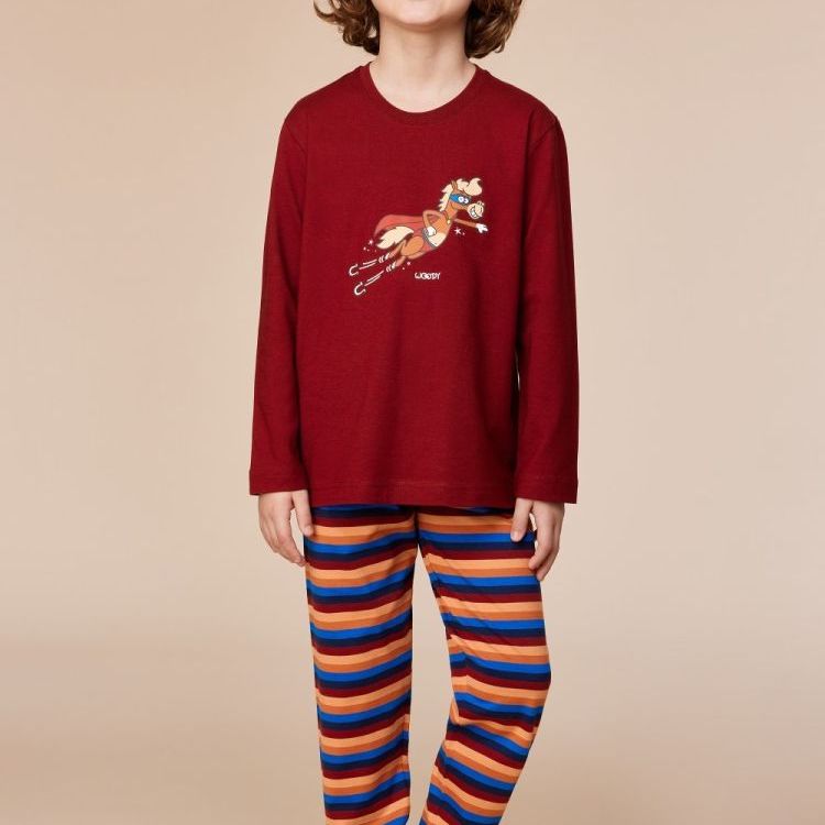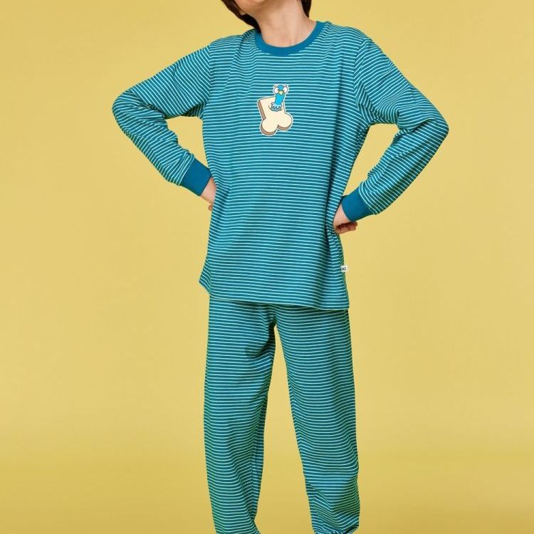 252-10-QRM-V/897Donkerblauwe pyjama van velours met contrasterende groene mouwen. Op het bovenstuk staat de tekst 'Nope' en de broek heeft zakken. Verkrijgbaar in de maten 24m/2y-XXL.