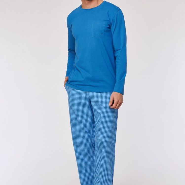Pyjama van blauw geweven katoen met effen bovenstuk en geruite broek met zakken. Verkrijgbaar in de maten 4y-XXL.