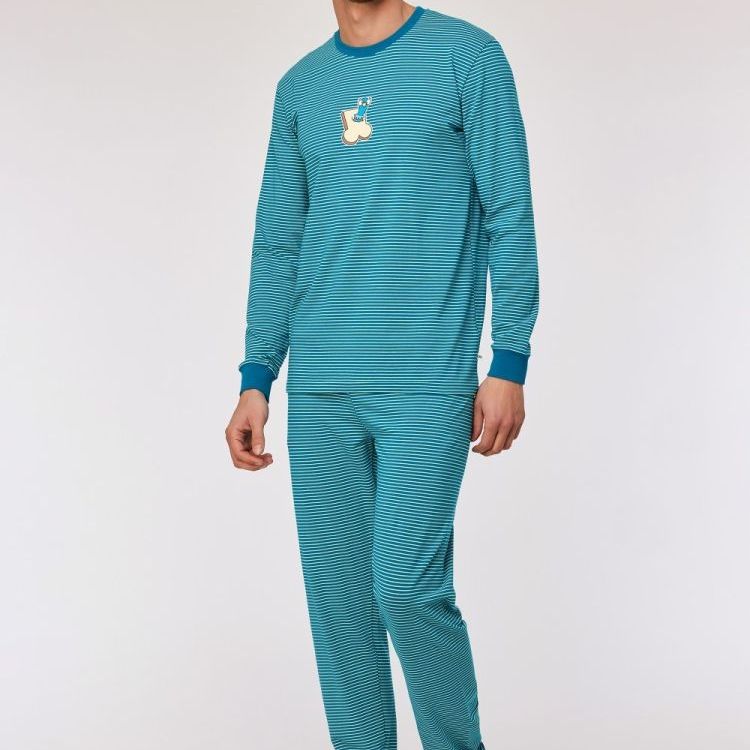 252-10-QRM-V/495Pyjama van velours met contrasterende donkerblauwe mouwen en broek. Op het bovenstuk staat de tekst 'trouble maker' en de broek heeft zakken. Verkrijgbaar in de maten 24m/2y-XXL.
