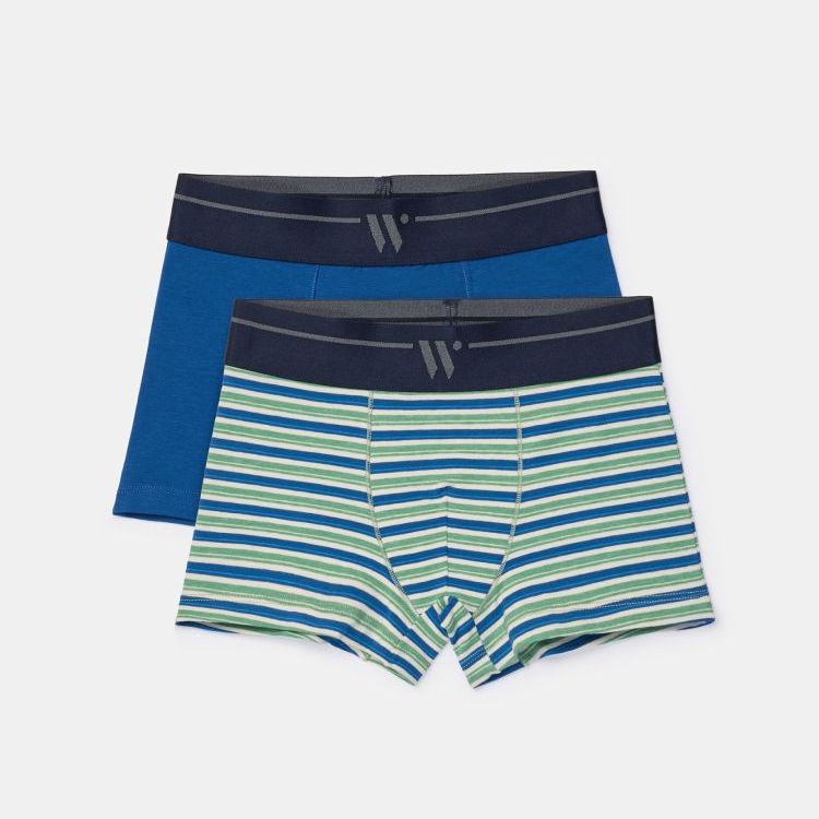 Set van 2 aansluitende jongens en heren boxershorts van rekbaar, soepel katoen. Het duopack bestaat uit een effen donkerblauwe boxershort en een blauwe-groene gestreepte boxershort. Kleurrijk ondergoed in de gekende Woody kwaliteit. Verkrijgbaar in maten 6Y-XXL.