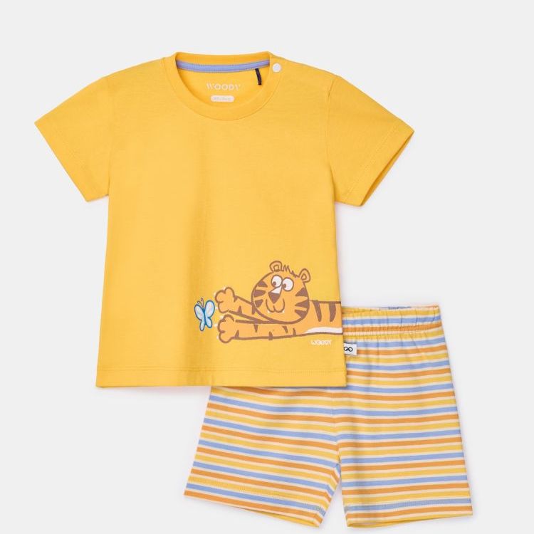 Jongens en heren pyjama van soepel katoen. Het effen gele bovenstuk valt op door de grote vrolijke tijgerprint. Het bovenstuk wordt gecombineerd met een kleurrijk gestreepte short. Verkrijgbaar in de maten 3M-XXL.