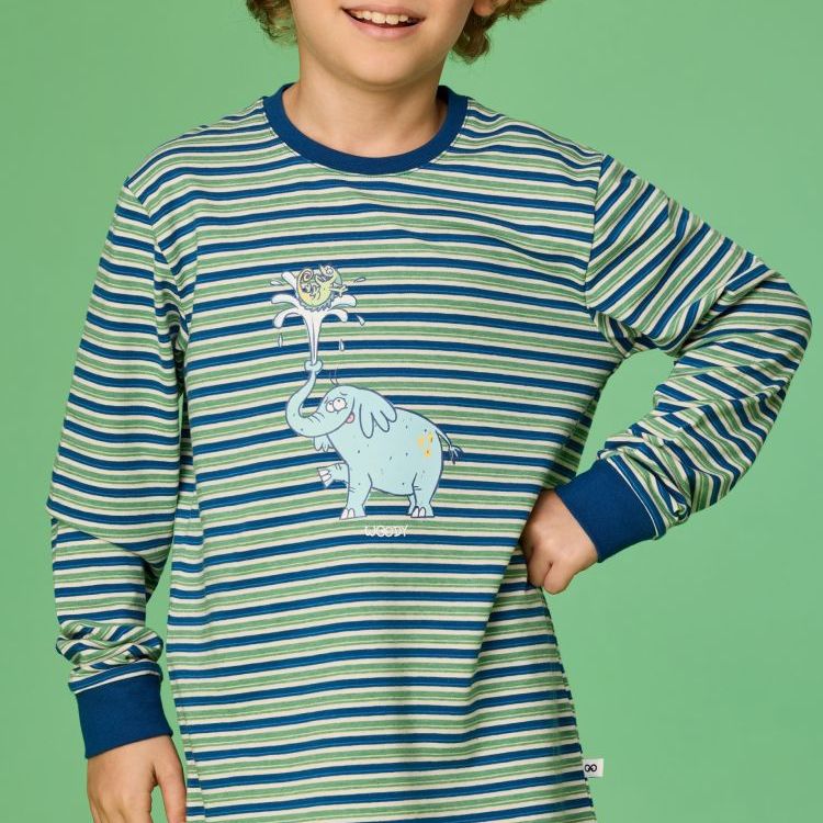 Tweedelige jongens en heren pyjamaset van soepel katoen. De T-shirt heeft een ronde hals, lange mouwen en is uitgevoerd in een horizontaal streeppatroon in meerdere blauwtinten en groen. Op de borst staat een centrale print van een olifant. De hals en manchetten zijn afgewerkt in een effen contrasterende kleur. De broek is donkerblauw, heeft een elastische tailleband en rechte pijpen met smalle boorden onderaan. Beschikbaar in de maten 3m-XXL.